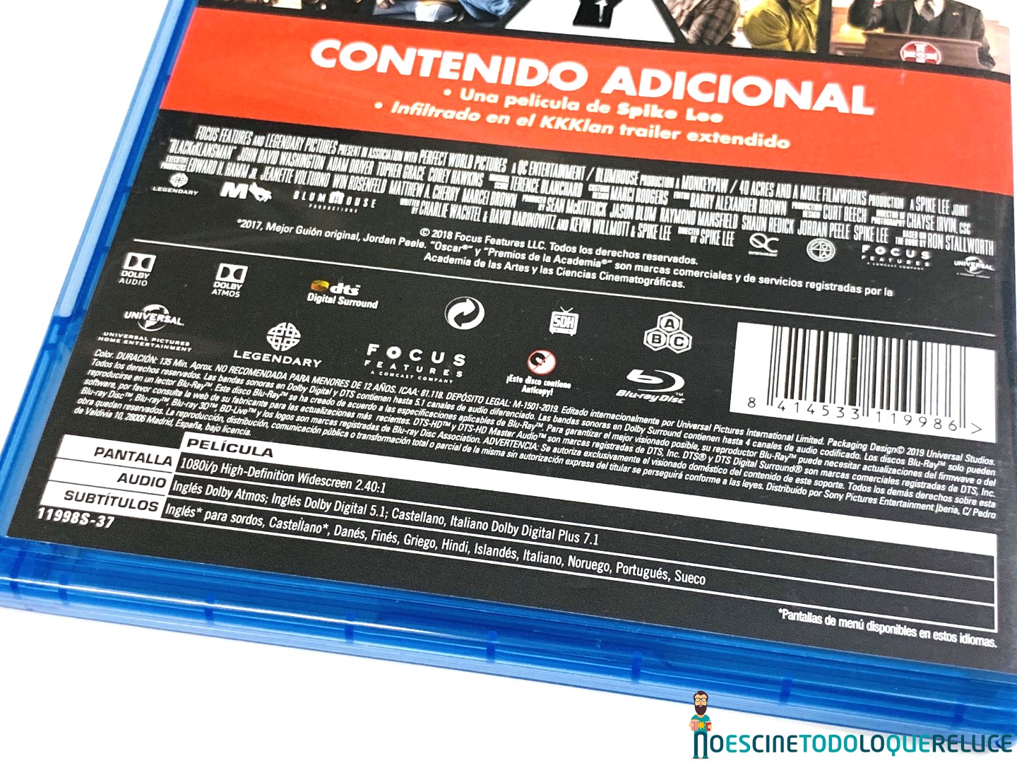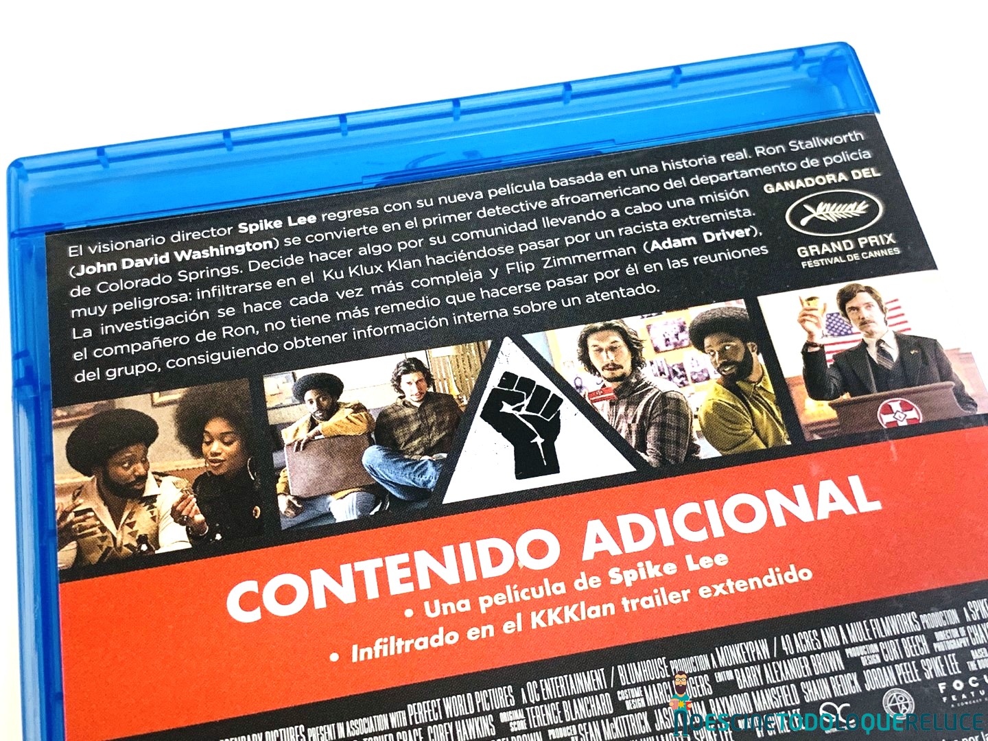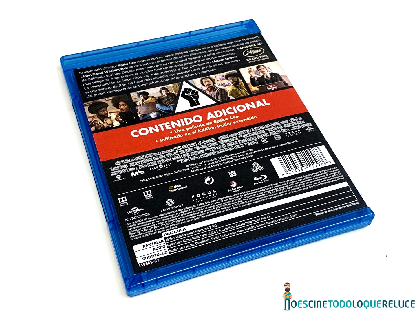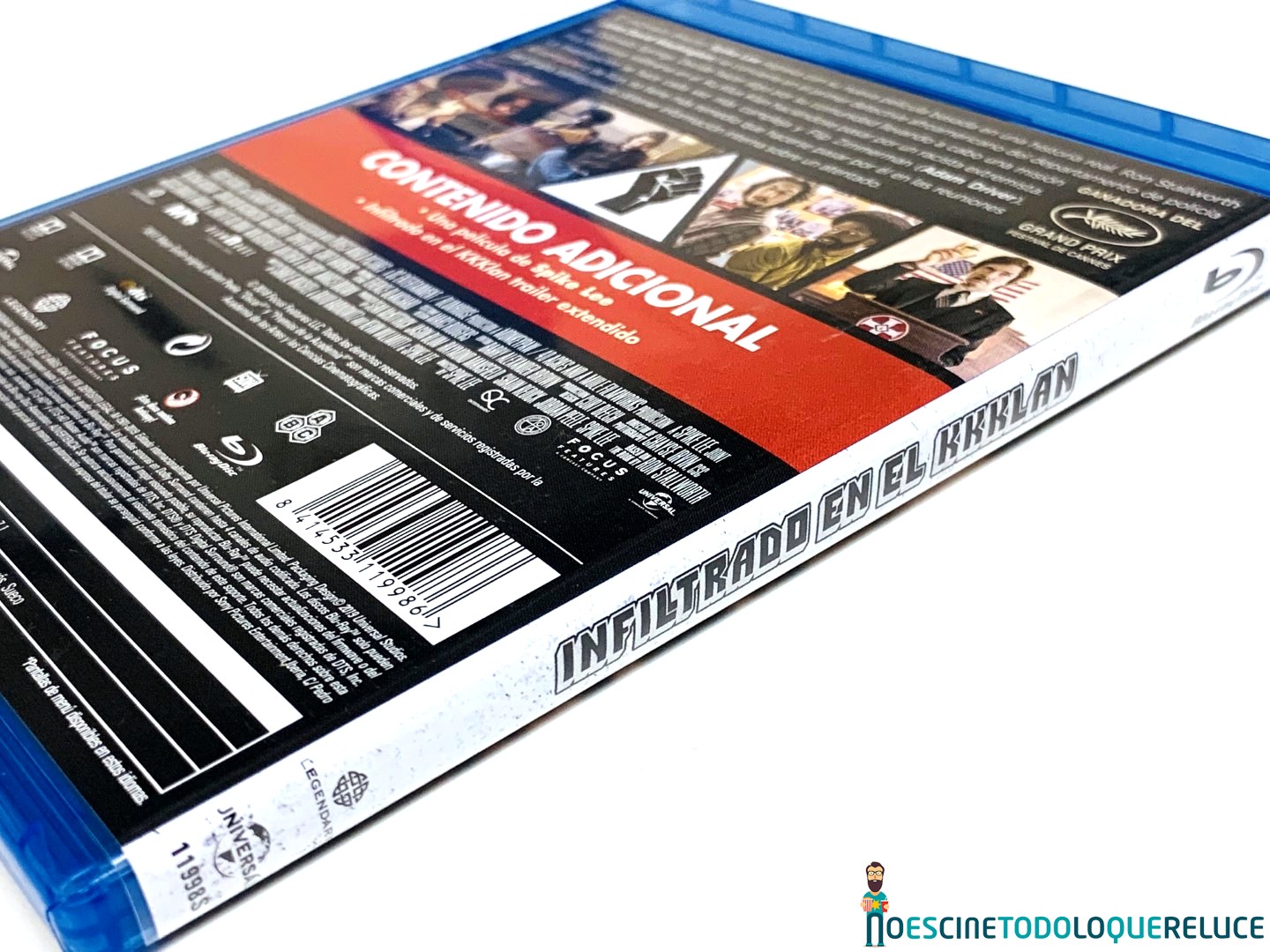 La edición Blu-ray de Infiltrado en el KKKlan está presentada en el clásico estuche azul con un póster de la película en la portada, mientras que la contraportada nos presenta una selección de imágenes de la misma junto a los datos técnicos, artísticos y sinopsis. En el interior nos encontramos el disco Blu-ray serigrafiado con una imagen del protagonista.