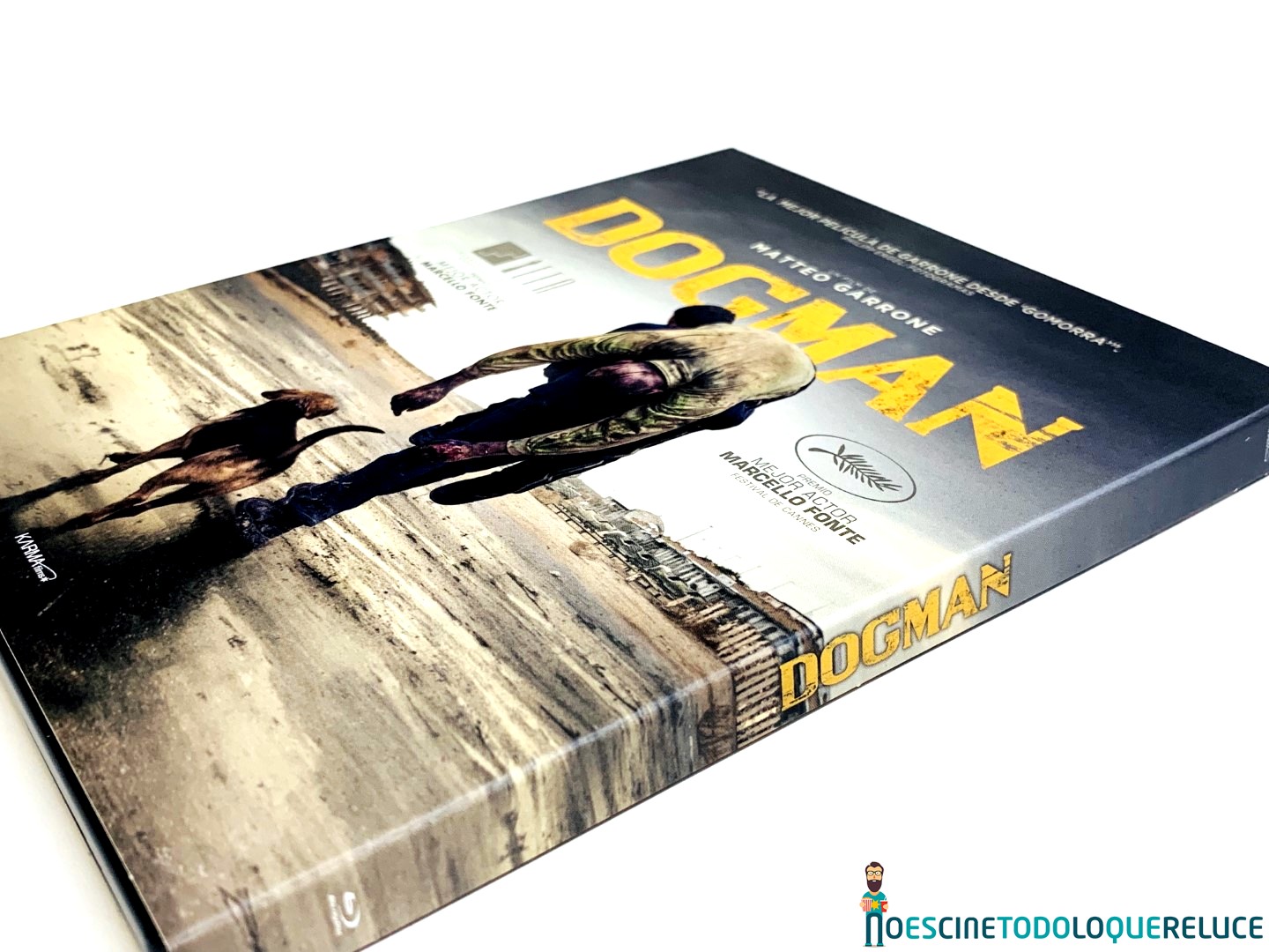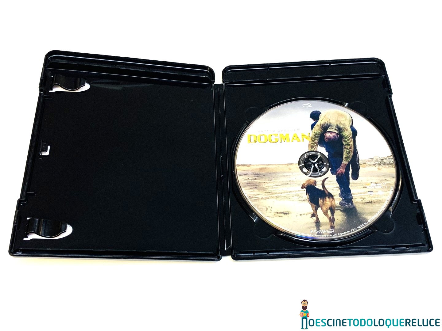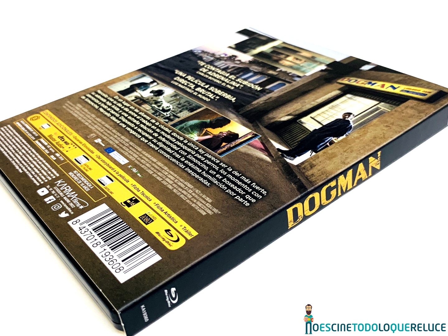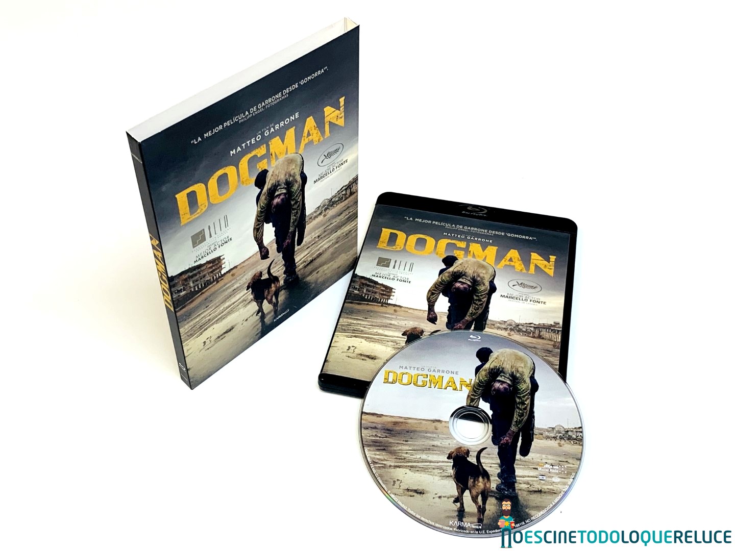 La edición Blu-ray de Dogman está presentada en una elegante funda slipcover que protege un estuche de color negro, ambos con el mismo diseño de portada y contraportada, ofreciendo en la parte frontal el póster de la película, mientras que la contraportada nos presenta una selección de imágenes de la misma junto a los datos técnicos, artísticos y sinopsis. En el interior nos encontramos el disco Blu-ray serigrafiado con la misma imagen de la portada.