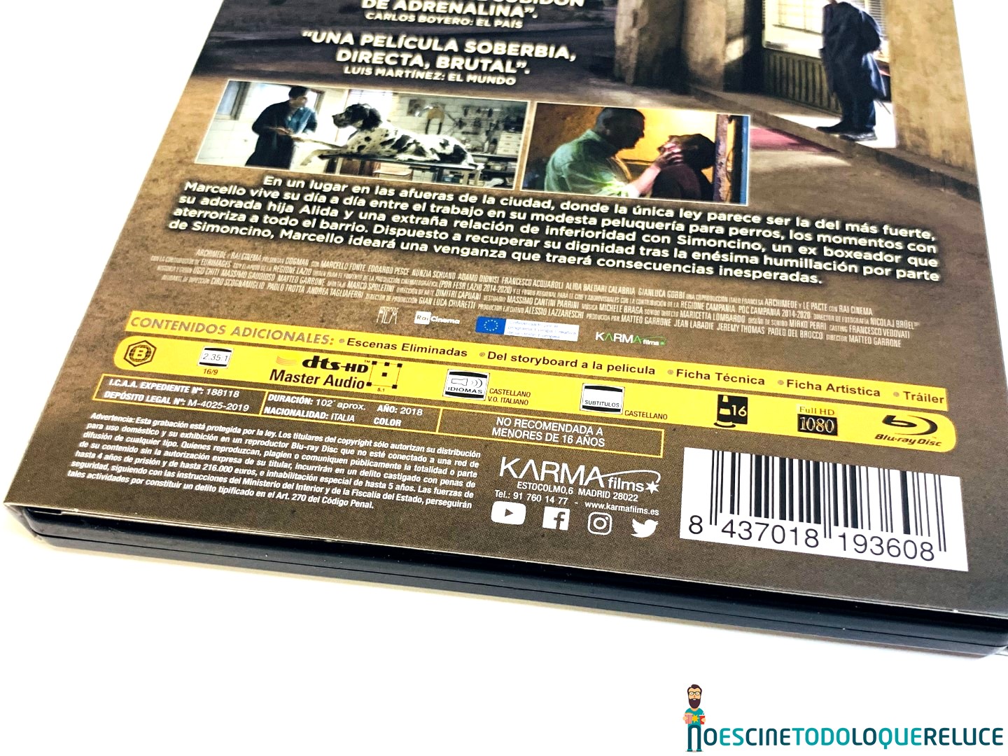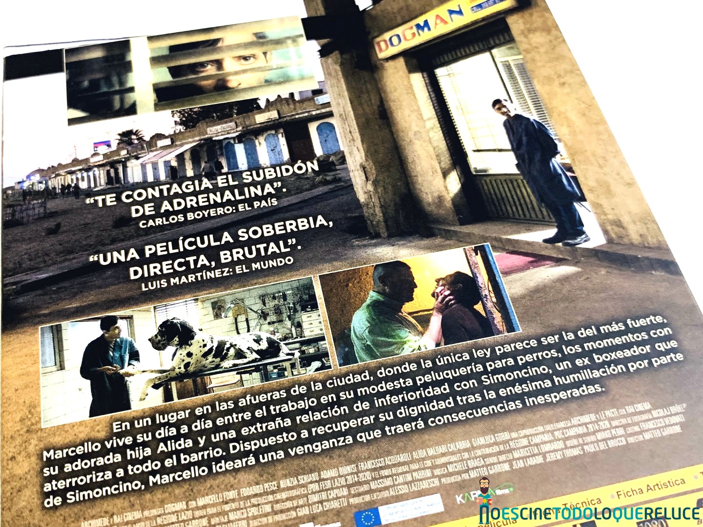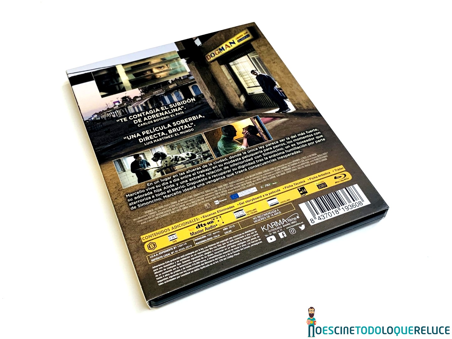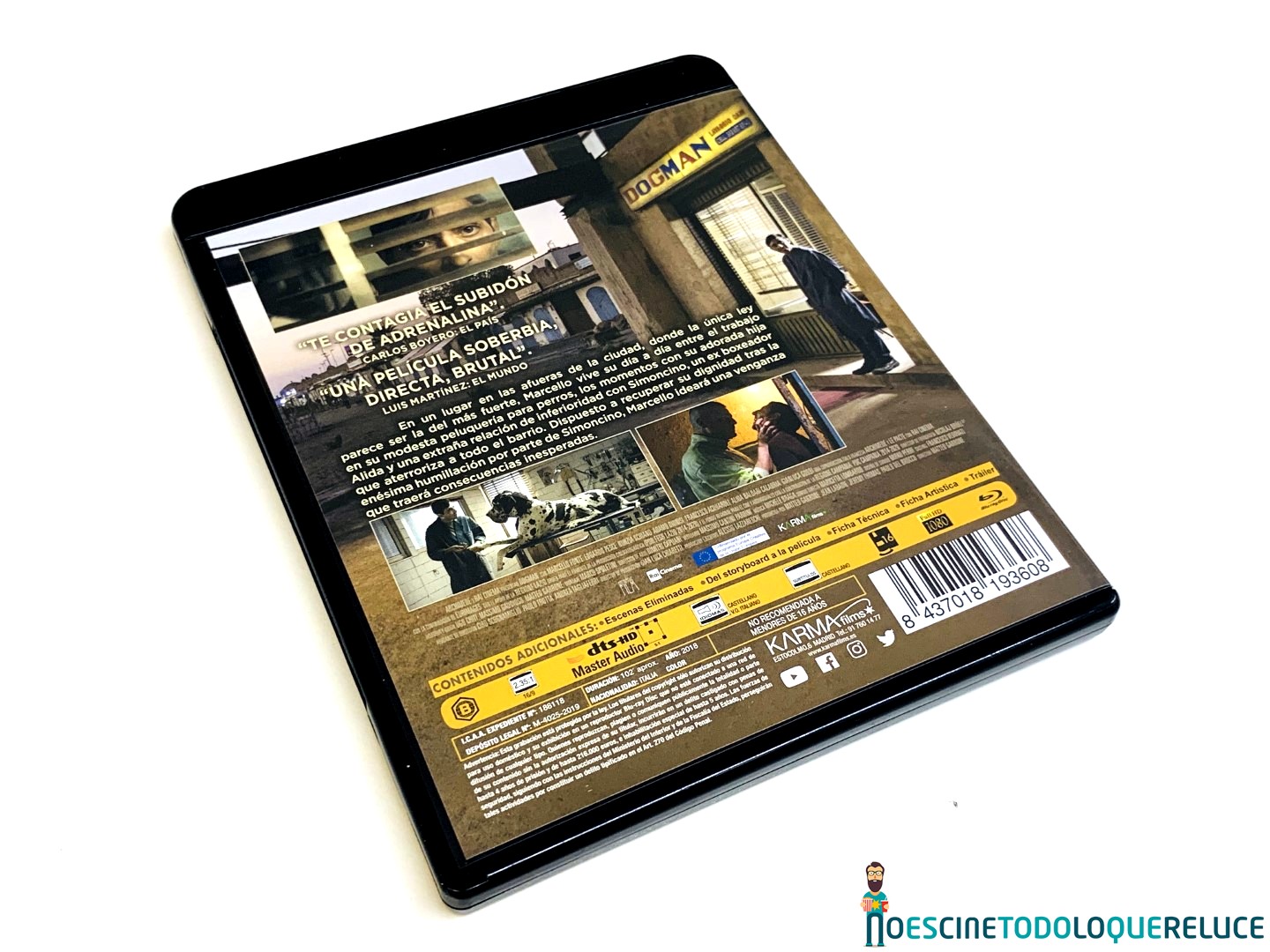 La edición Blu-ray de Dogman está presentada en una elegante funda slipcover que protege un estuche de color negro, ambos con el mismo diseño de portada y contraportada, ofreciendo en la parte frontal el póster de la película, mientras que la contraportada nos presenta una selección de imágenes de la misma junto a los datos técnicos, artísticos y sinopsis. En el interior nos encontramos el disco Blu-ray serigrafiado con la misma imagen de la portada.