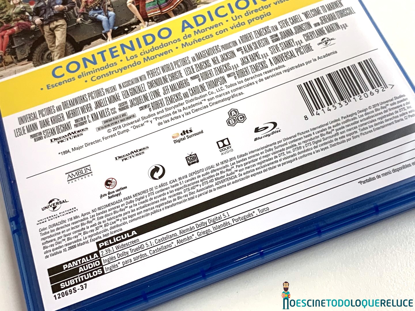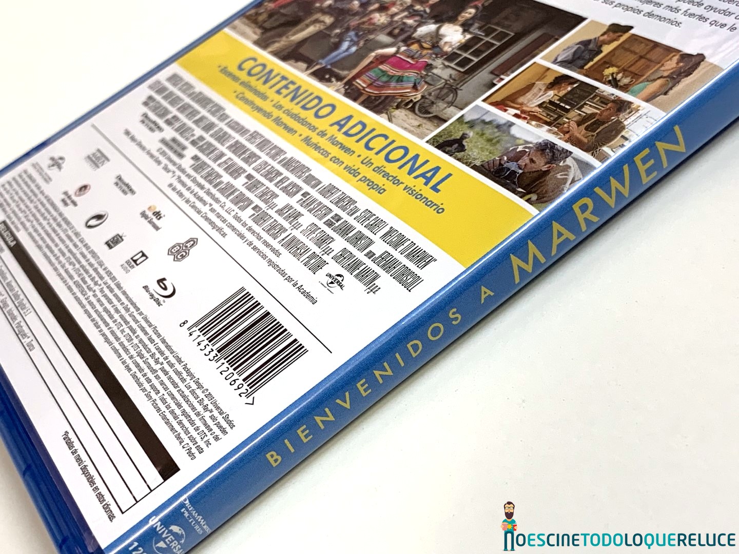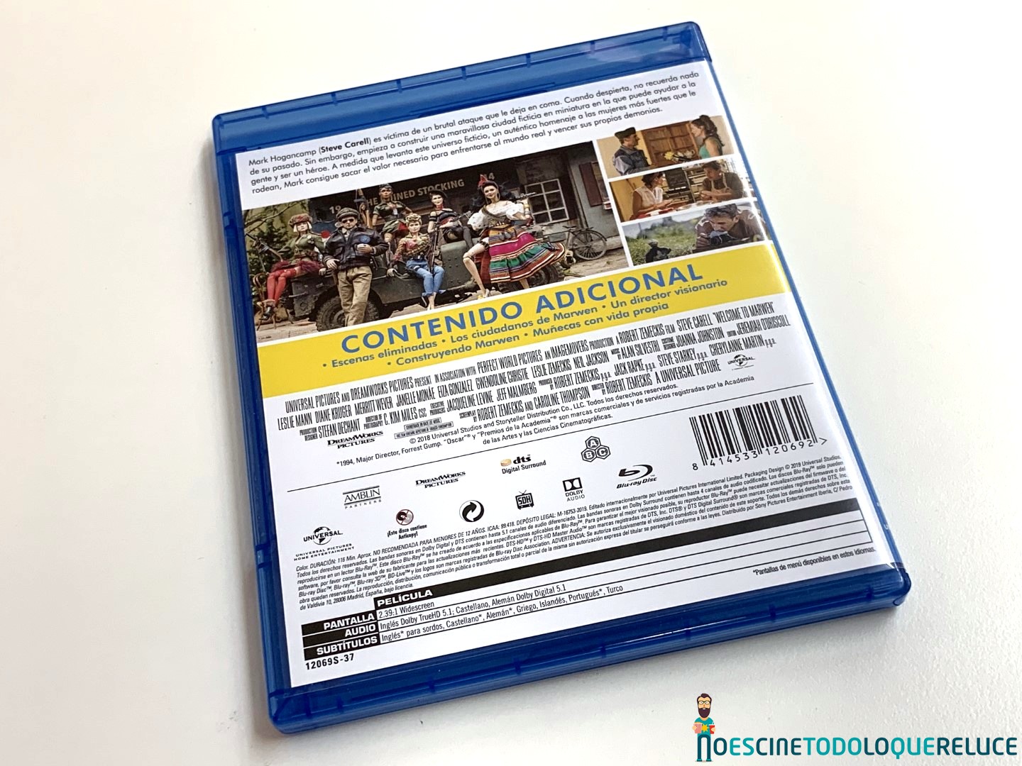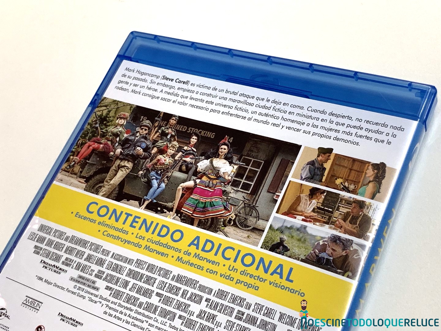 La edición Blu-ray de Bienvenidos a Marwen está presentada en el clásico estuche azul con el póster de la película en la portada, mientras que la contraportada nos presenta una selección de imágenes de la misma junto a los datos técnicos, artísticos y sinopsis. En el interior nos encontramos el disco Blu-ray serigrafiado con la imagen de la portada sin el título.