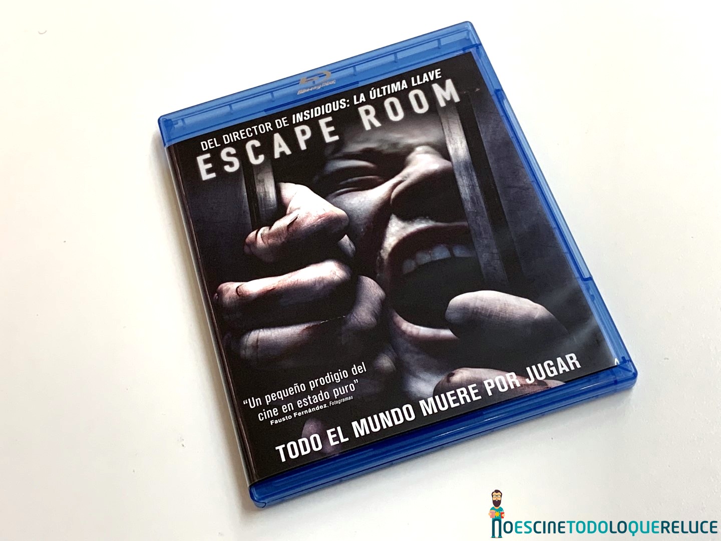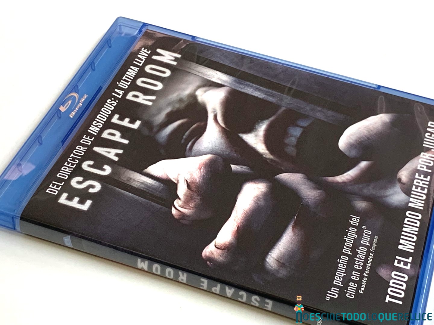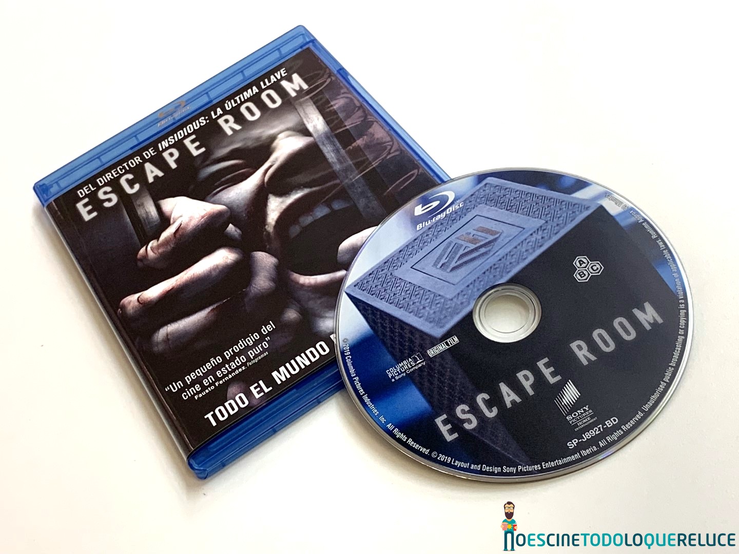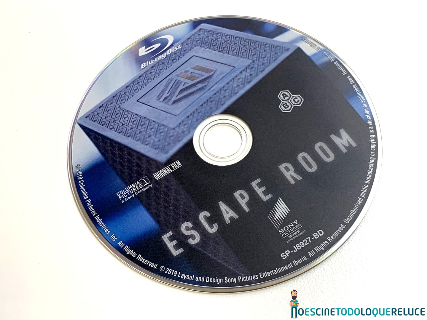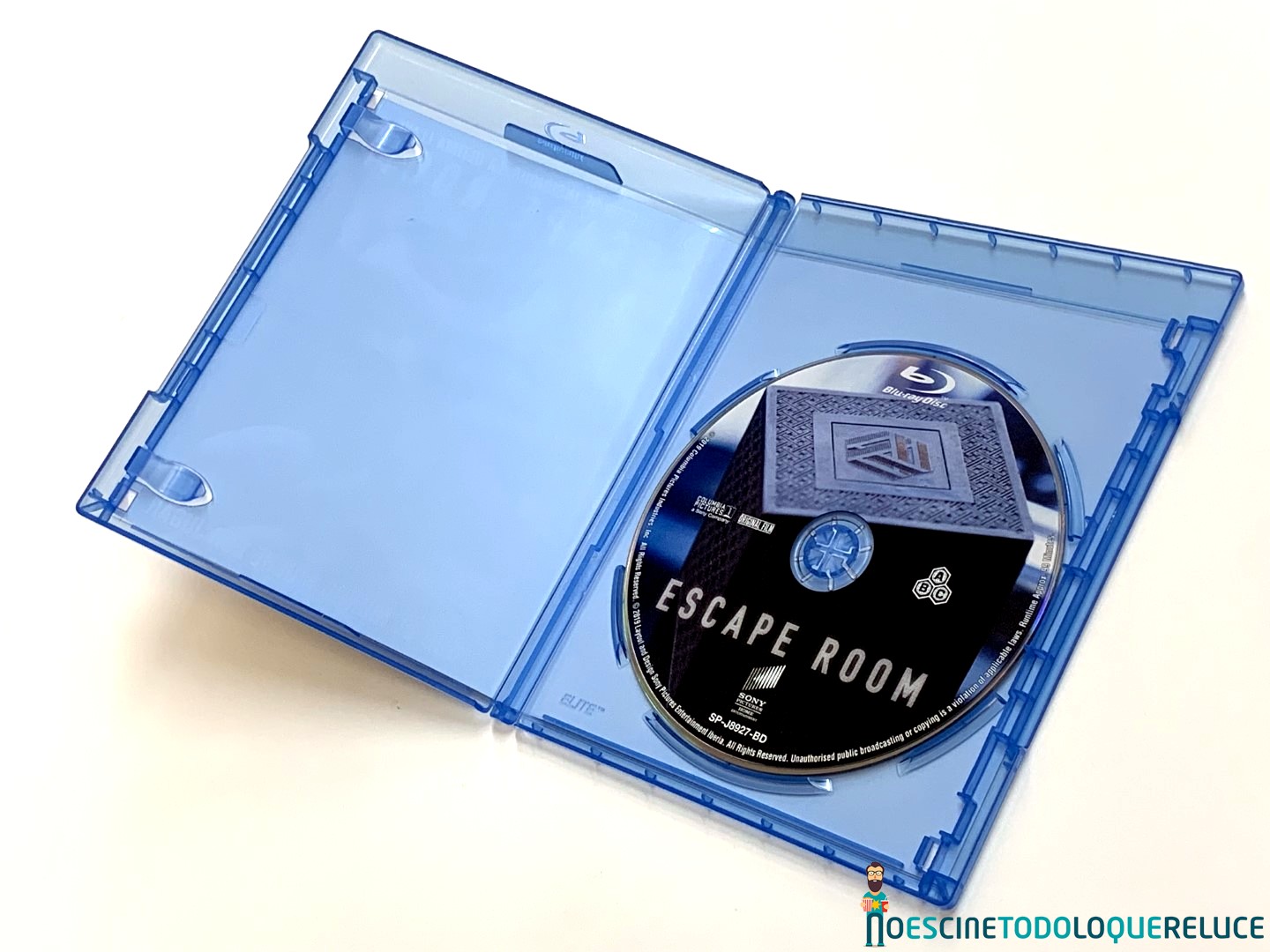 La edición Blu-ray de Escape Room está presentada en el clásico estuche azul con el póster de la película en la portada, mientras que la contraportada nos presenta una selección de imágenes de la misma junto a los datos técnicos, artísticos y sinopsis. En el interior nos encontramos el disco Blu-ray serigrafiado con el título de la película sobre una fotografía del icónico cubo con el logo de la compañía Minos.