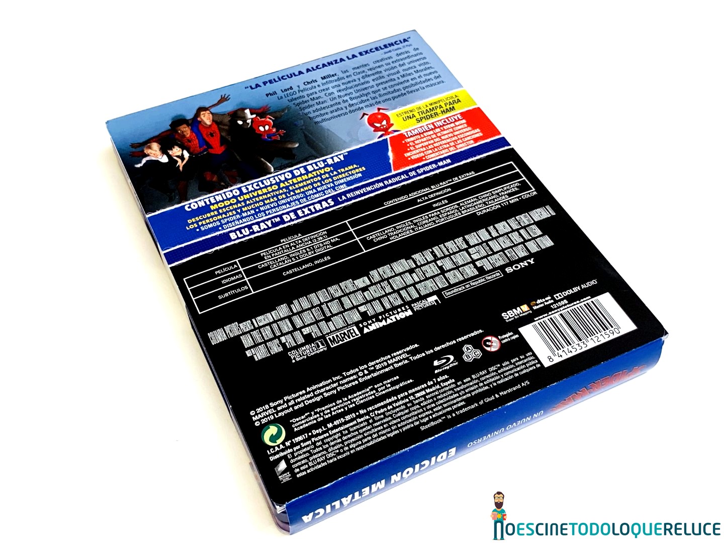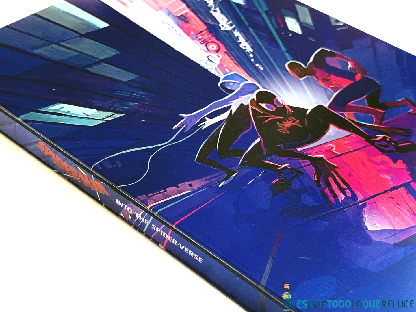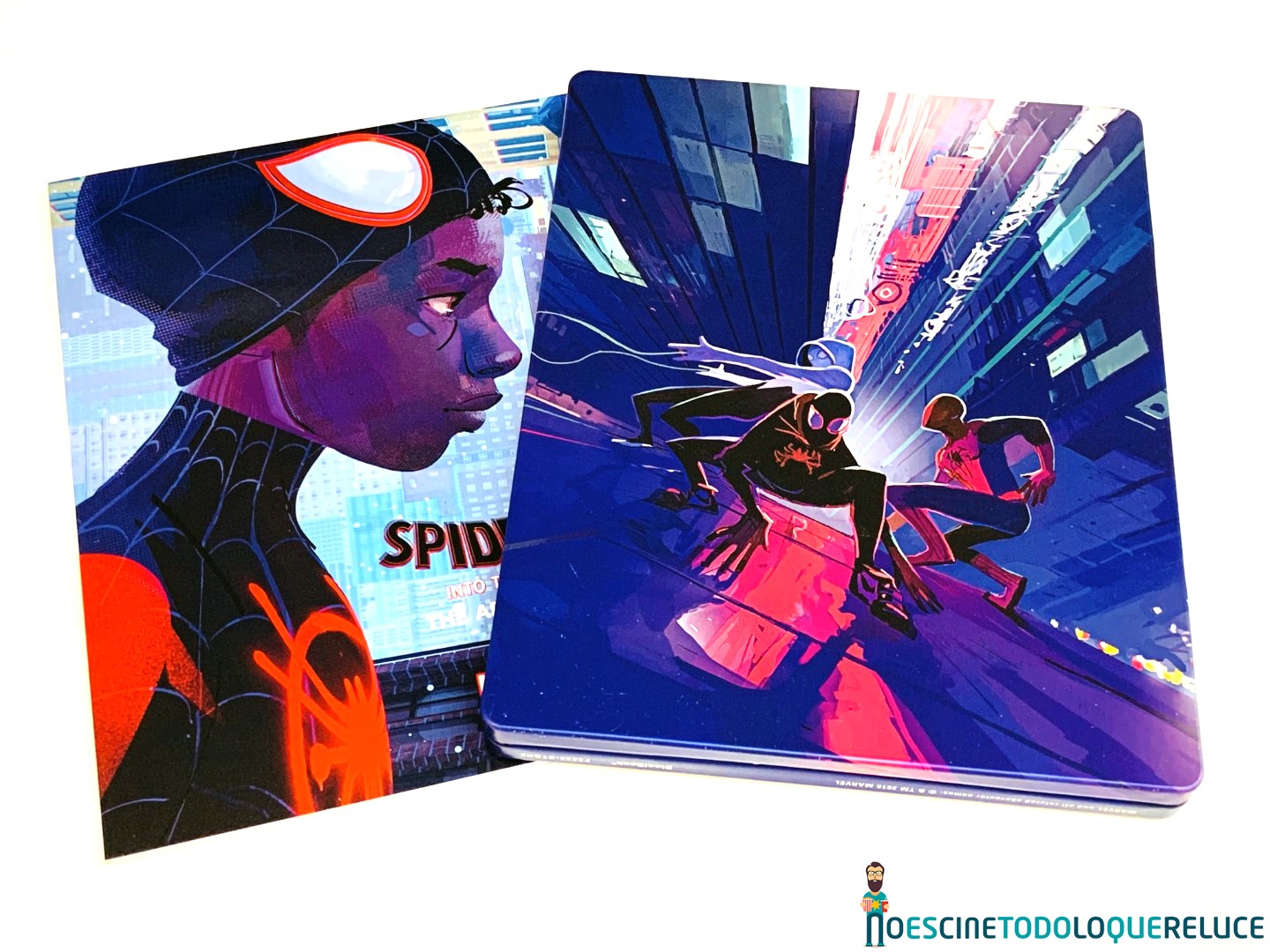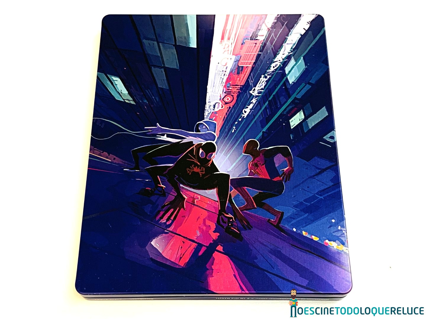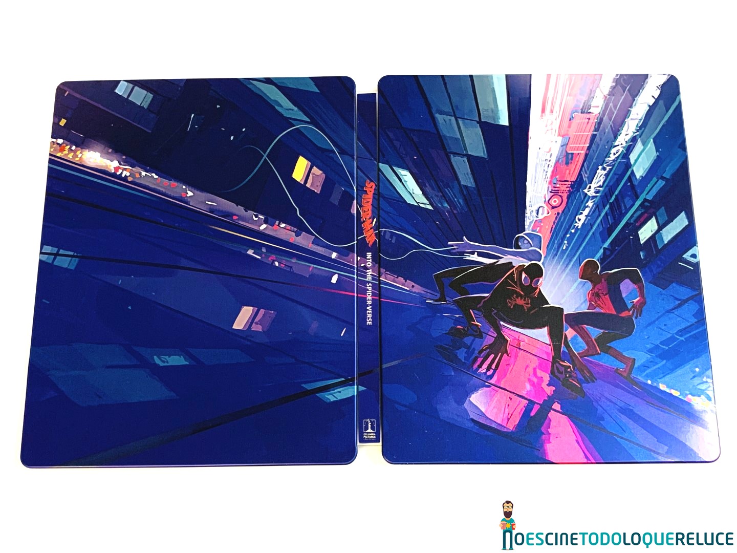 Esta edición Blu-ray de Spider-Man: Un nuevo Universo está presentada en un estuche metálico con tonos mates con una preciosa ilustración que abarca tanto portada como contraportada. El lomo del steelbook nos muestra el título en versión original.