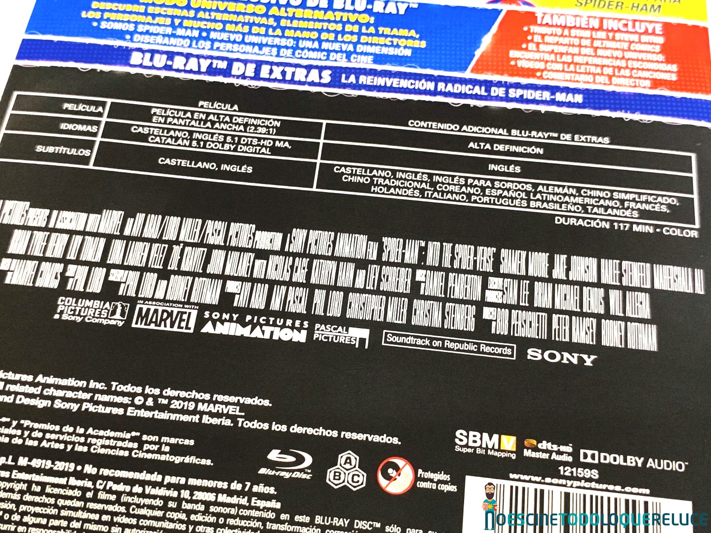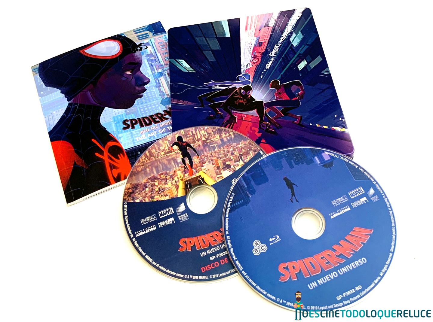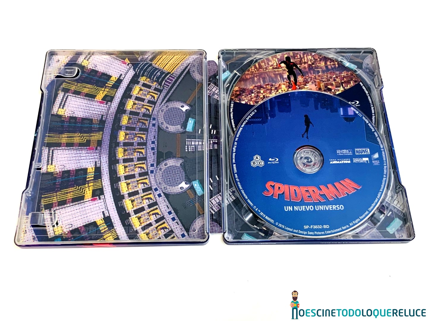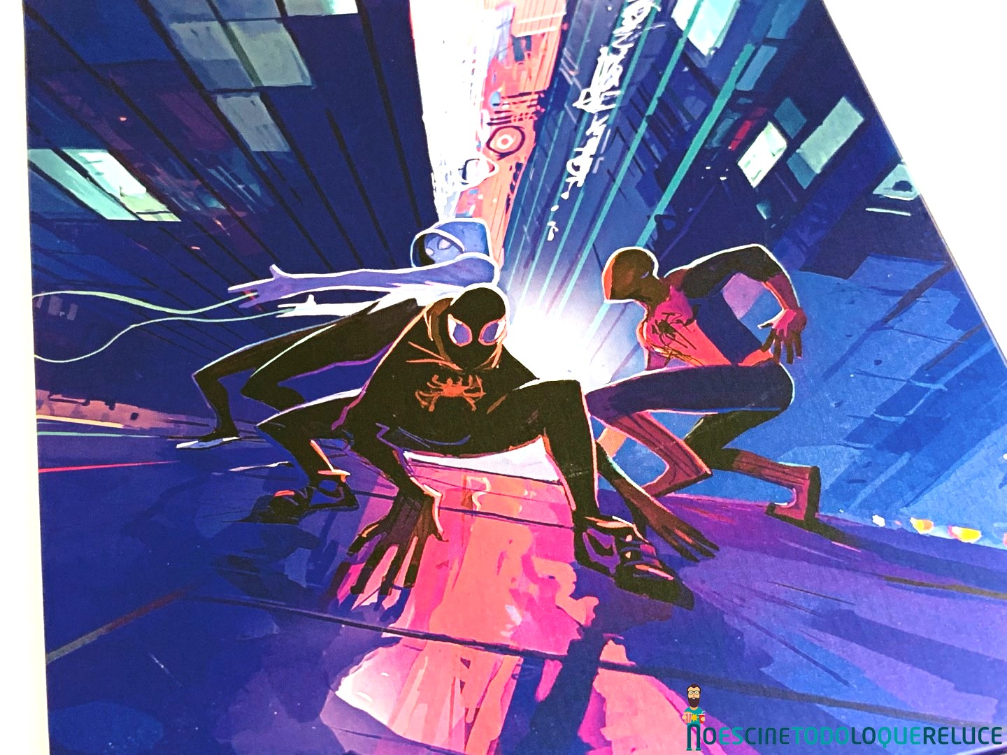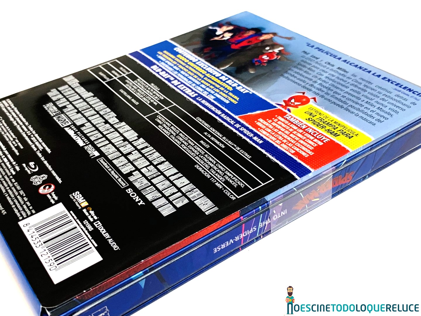 Esta edición Blu-ray de Spider-Man: Un nuevo Universo está presentada en un estuche metálico con tonos mates con una preciosa ilustración que abarca tanto portada como contraportada. El lomo del steelbook nos muestra el título en versión original.