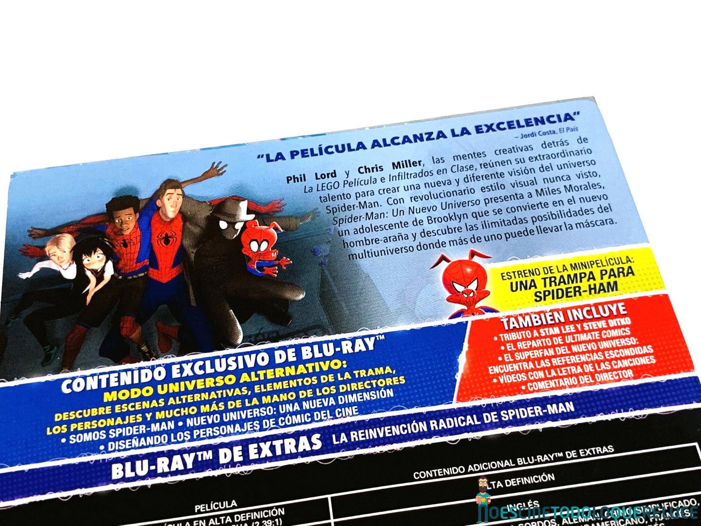 - Comentario del director. El coguionista y productor Phil Lord, el productor Chris Miller, los directores Bob Persichetti y Peter Ramsey, y el codirector y coguionista Rodney Rothman ofrecen una pista de audio divertida, pero también muy completa que ofrece multitud de detalles.
