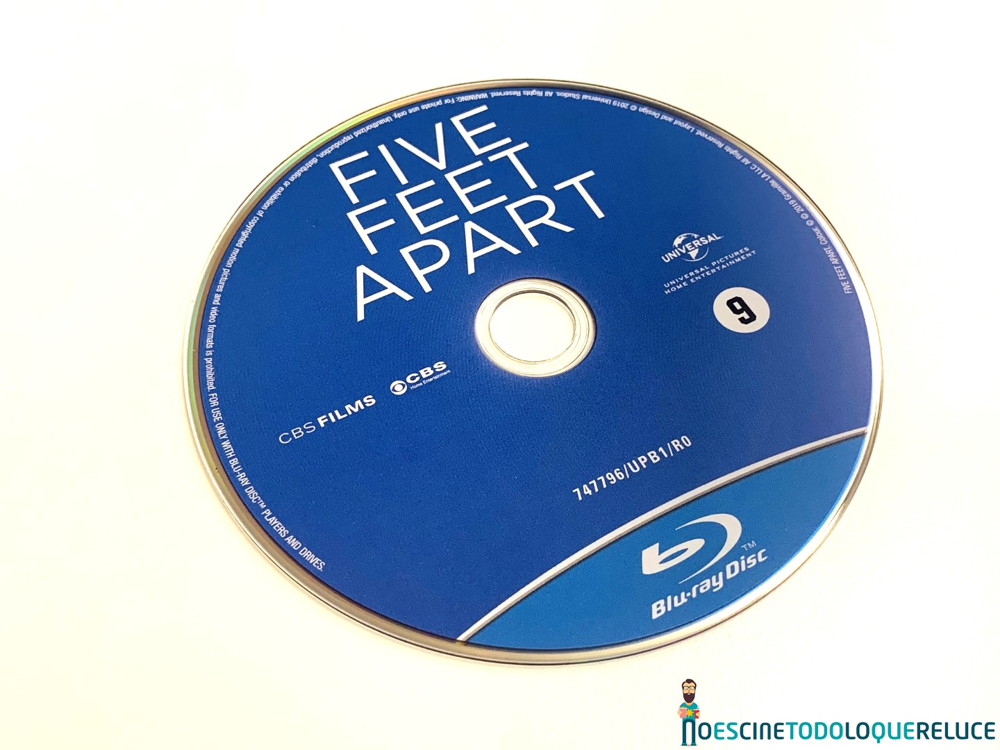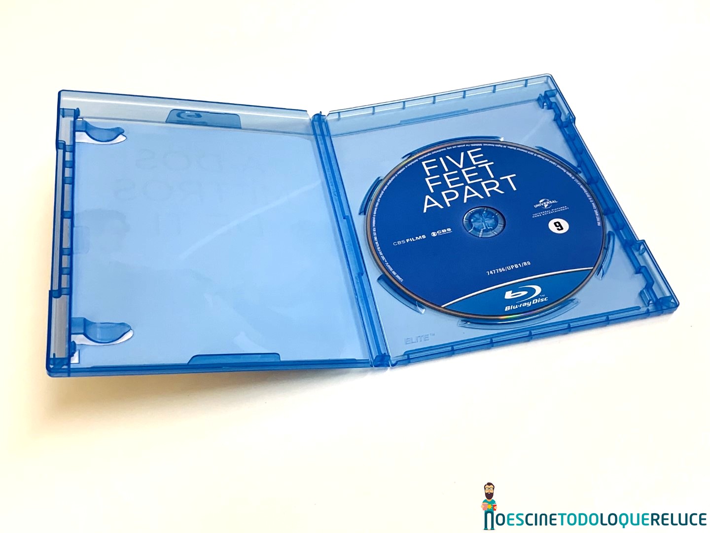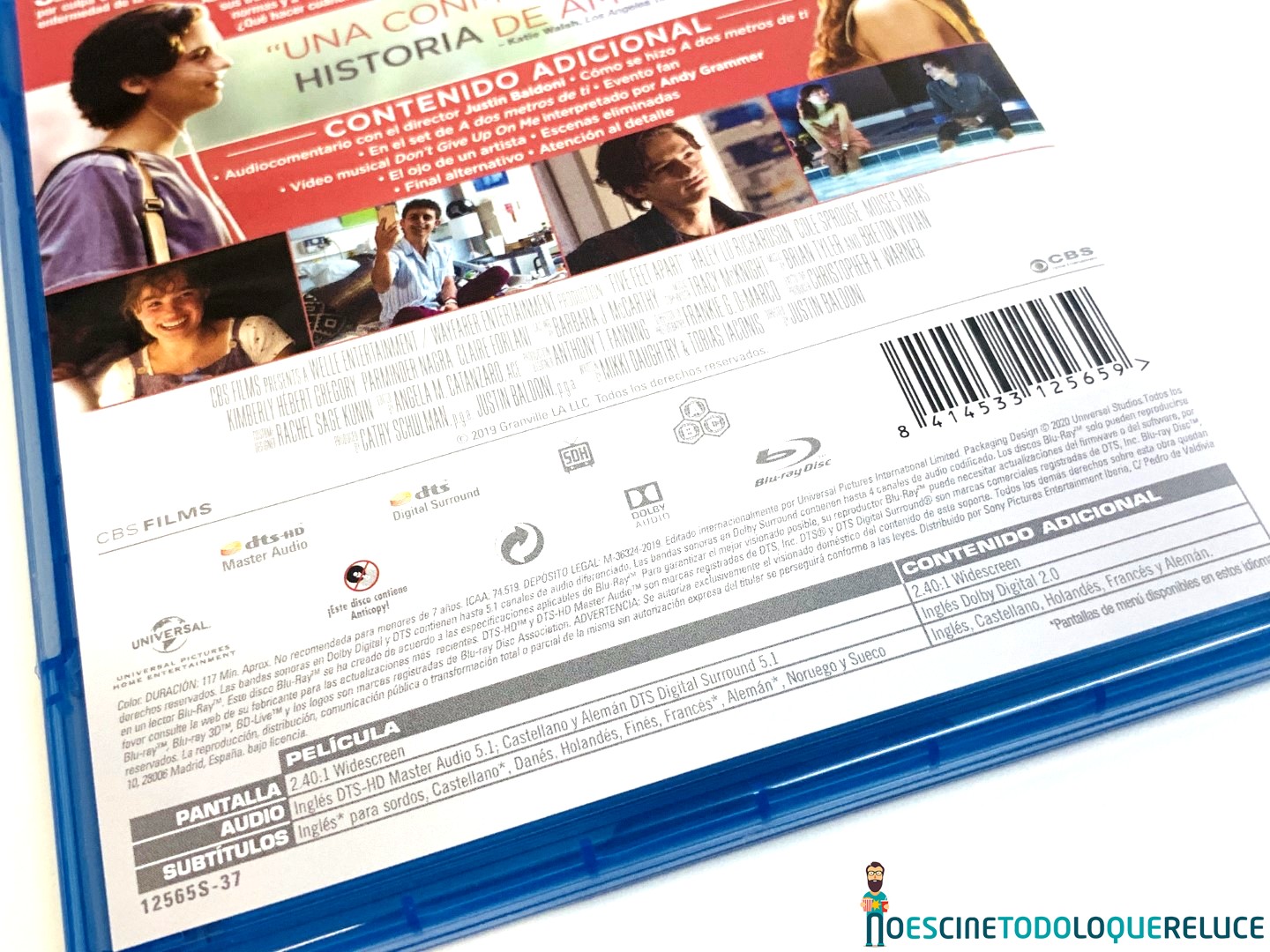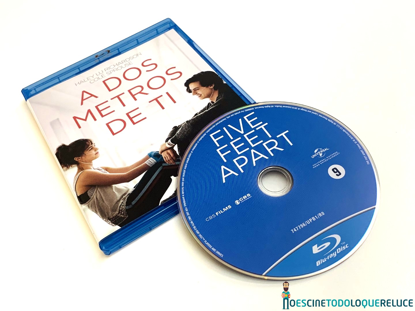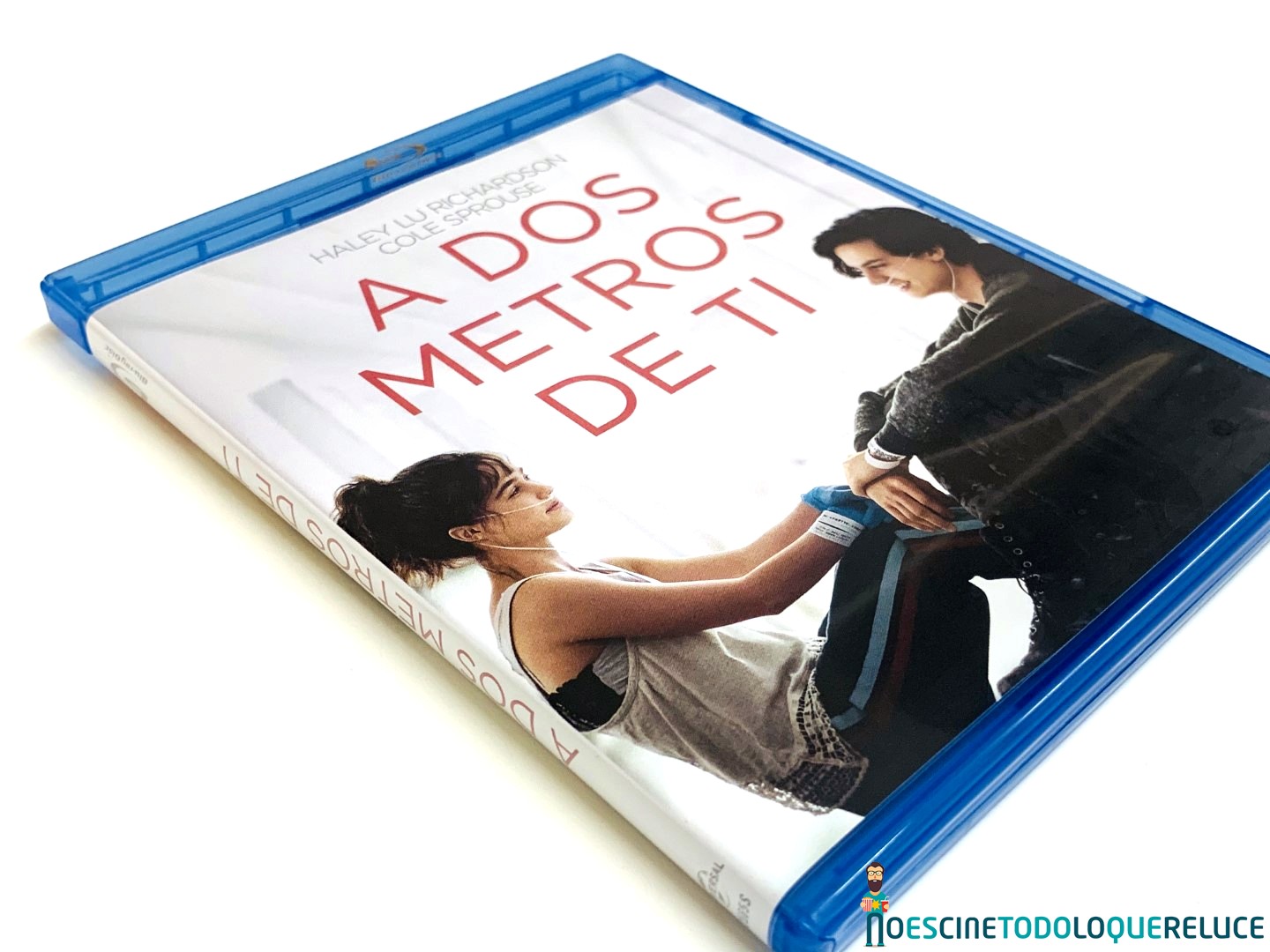 La edición Blu-ray de A dos metros de ti está presentada en el clásico estuche azul con el póster de la película en la portada, mientras que la contraportada nos presenta una selección de imágenes de la misma junto a los datos técnicos, artísticos y sinopsis. En el interior nos encontramos el disco Blu-ray con el título en versión original sobre fondo azul.