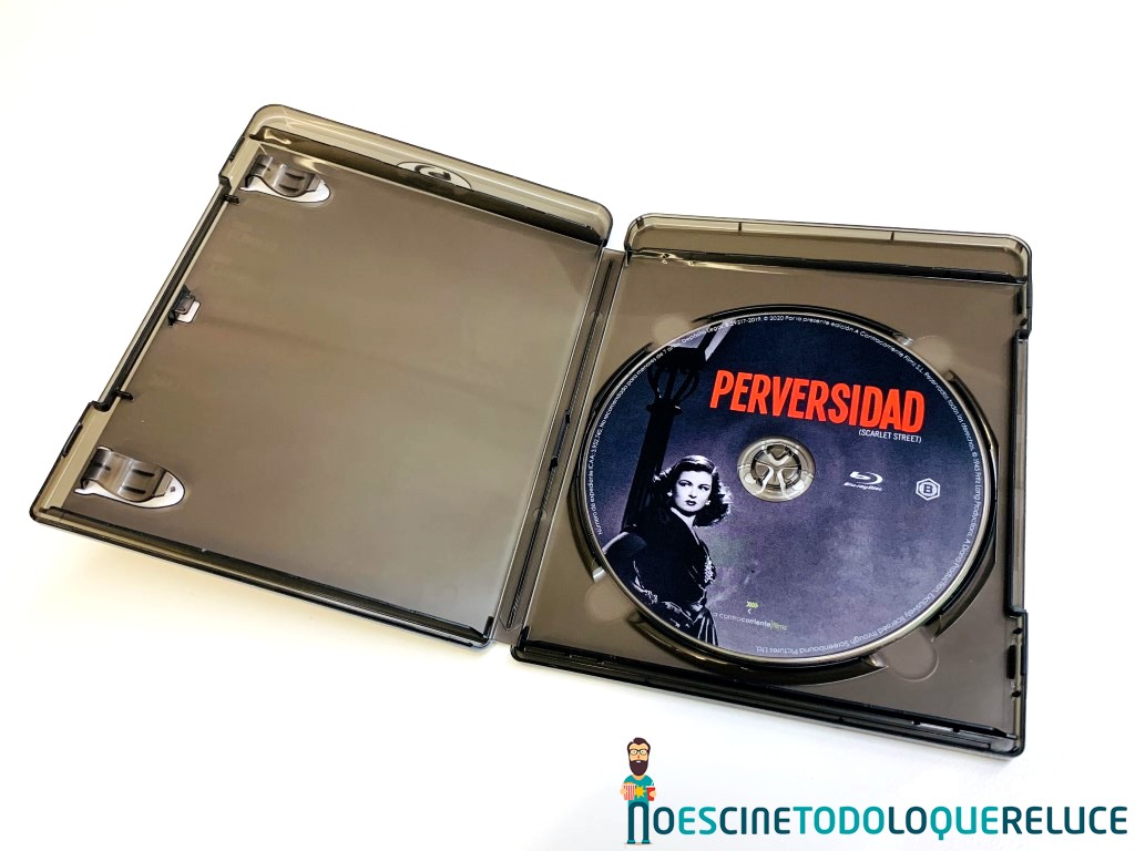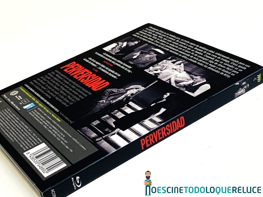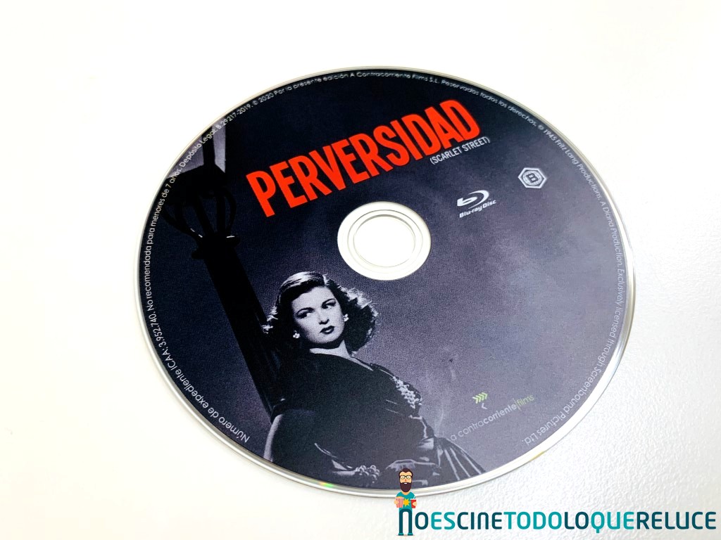 La edición Blu-ray de Perversidad está presentada en una funda slipcover con el mismo diseño del estuche negro que protege, con el póster en la portada, mientras que la contraportada nos presenta algunas fotos junto a los datos técnicos, artísticos y sinopsis. Como es habitual en las ediciones de A Contracorriente Films, la funda es de color mate, sin brillos, y es un complemento perfecto para esta edición 75º aniversario que cuenta con máster restaurado. En el interior nos encontramos el disco Blu-ray que incluye serigrafiada la imagen de la portada con el título en español.