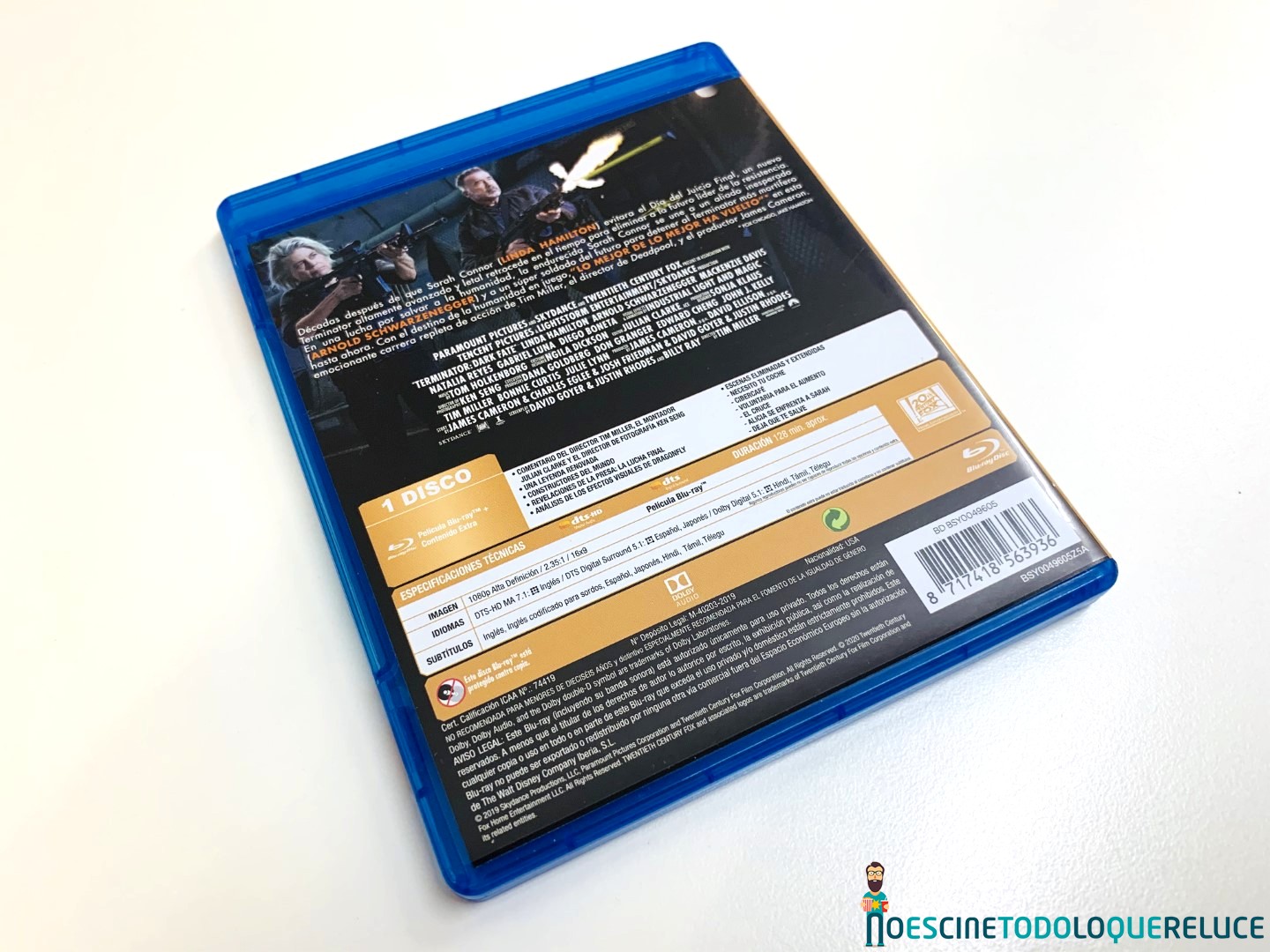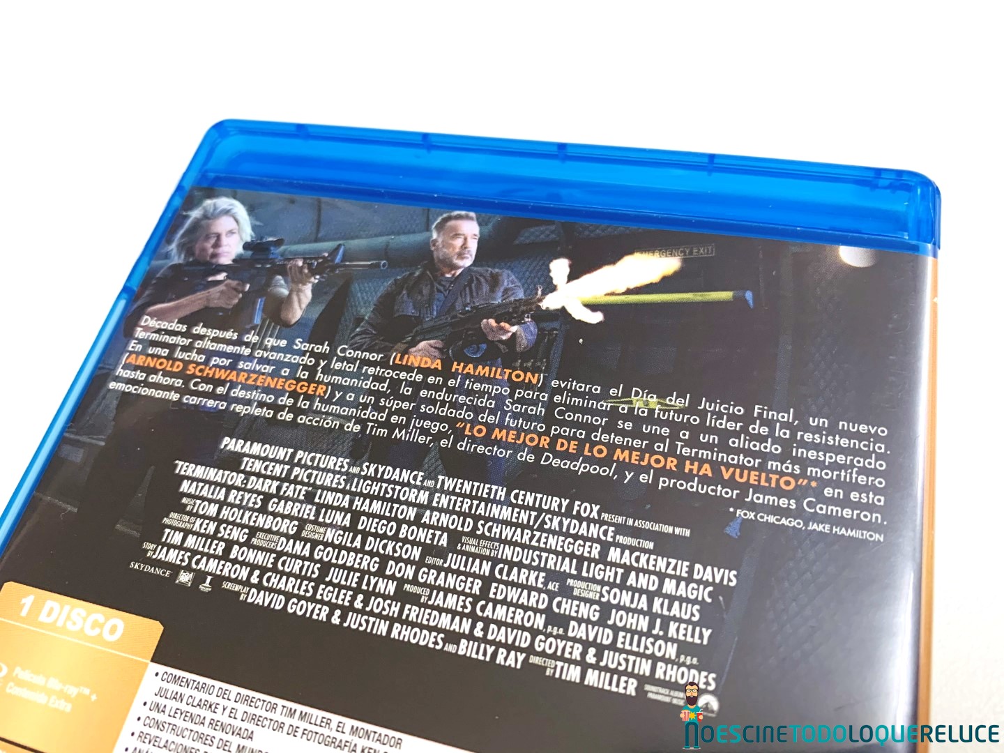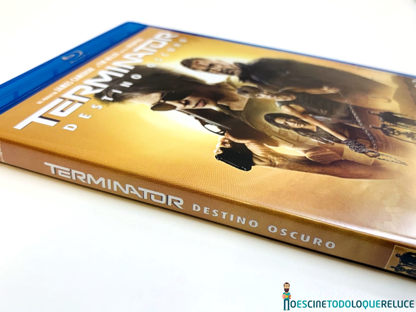 La edición Blu-ray de Terminator: Destino Oscuro está presentada en el clásico estuche amaray azul, con el póster oficial en la portada, mientras que la contraportada nos presenta una imagen de la película junto a los datos técnicos, artísticos y sinopsis. En el interior del estuche nos encontramos el disco Blu-ray con el título español sobre fondo azul, un diseño característico de los lanzamientos de Disney.