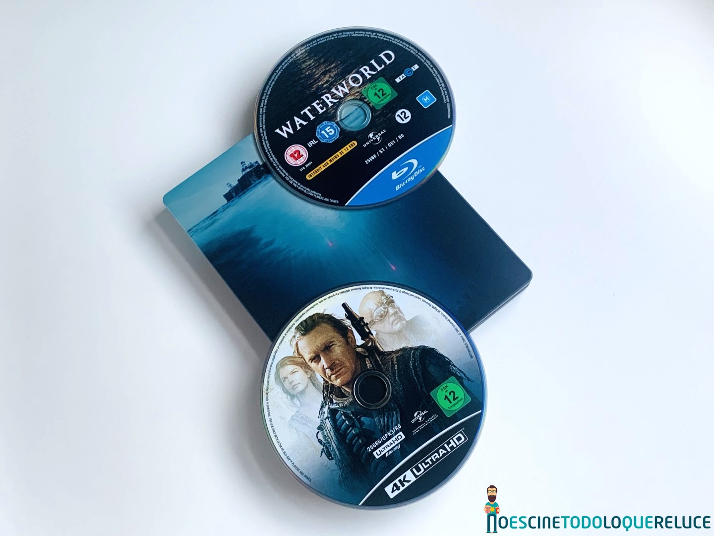 Este steelbook de diseño exclusivo de Waterworld contiene un disco 4K UHD y un disco Blu-ray, incluyendo en el primero de ellos la versión cinematográfica en 4K UHD y la versión extendida en HD como un extra, mientras que el disco Blu-ray incluye solo un tráiler como extra directamente:
