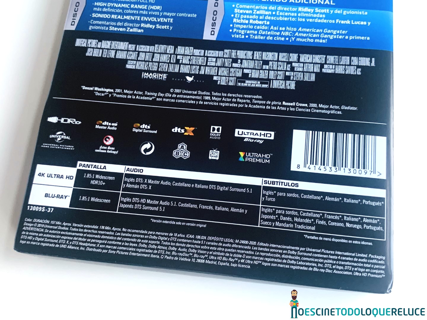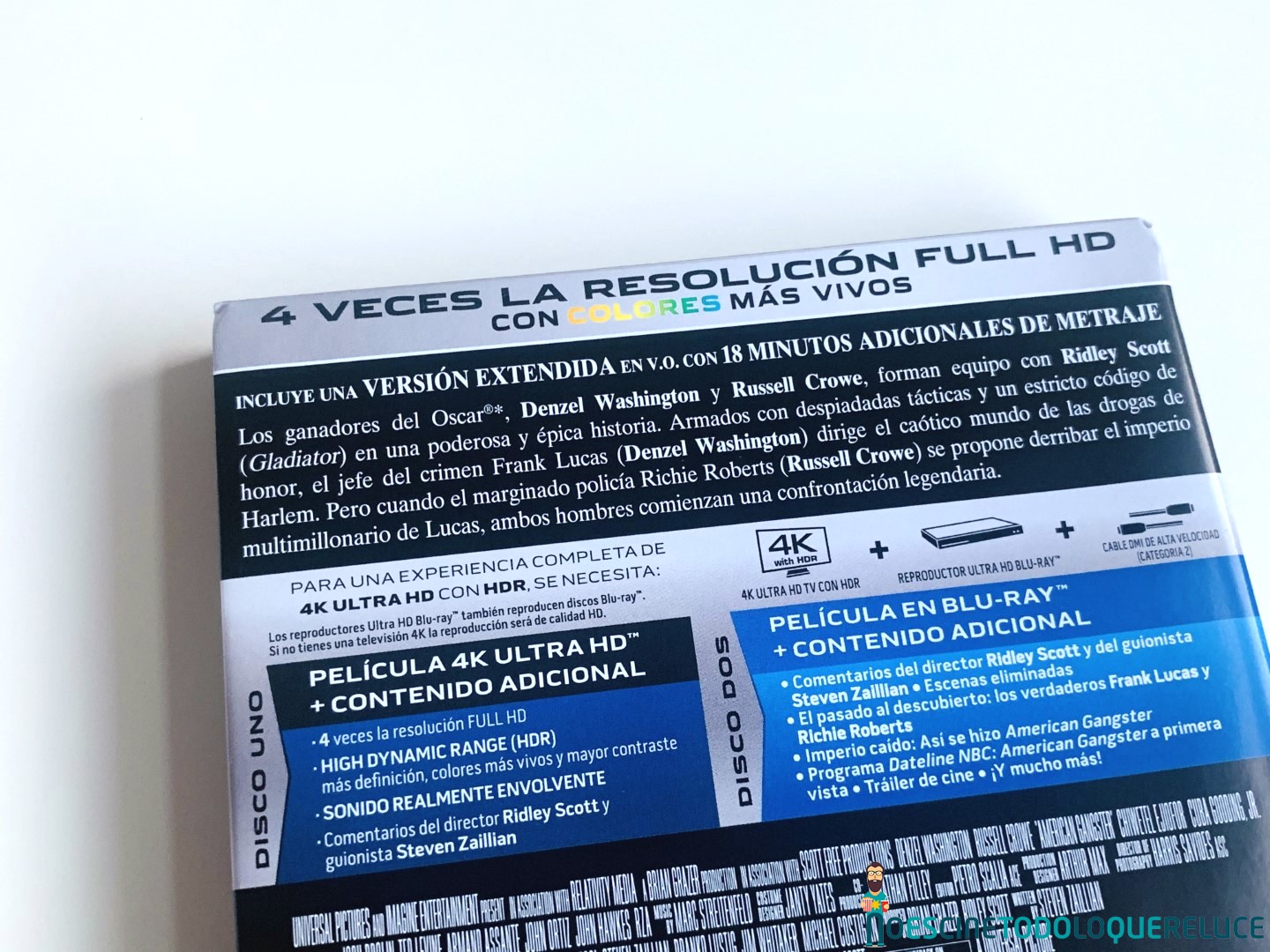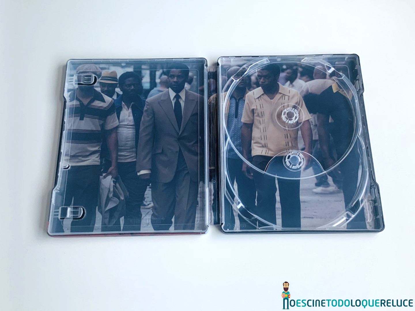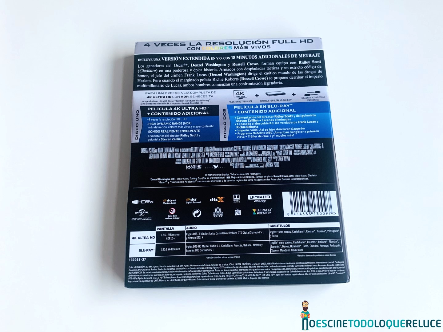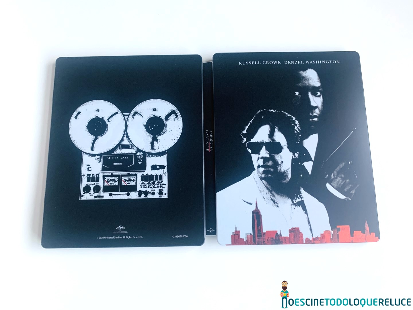 Aprovechando su reciente lanzamiento, os ofrecemos el análisis y un reportaje fotográfico de la edición metálica limitada de American Gangster que incluye discos 4K UHD y Blu-ray. El disco 4K UHD incluye la película en versión cinematográfica, pero también la versión extendida en versión original con 18 minutos adicionales de metraje. Por parte del disco Blu-ray, también incluye la versión comercial y la ampliada.