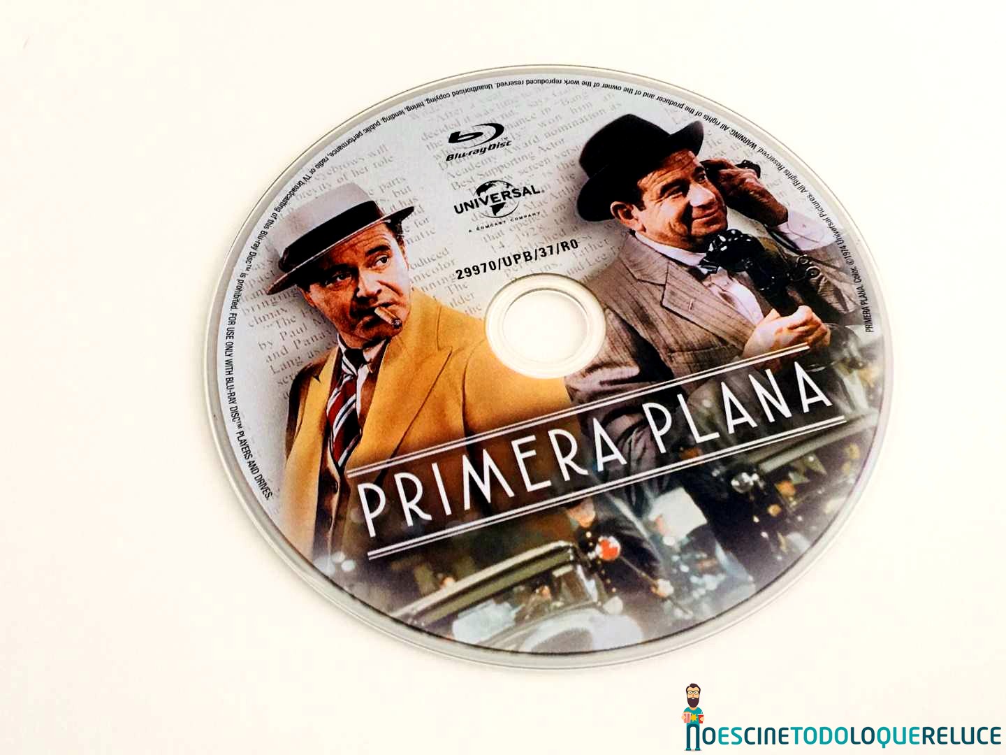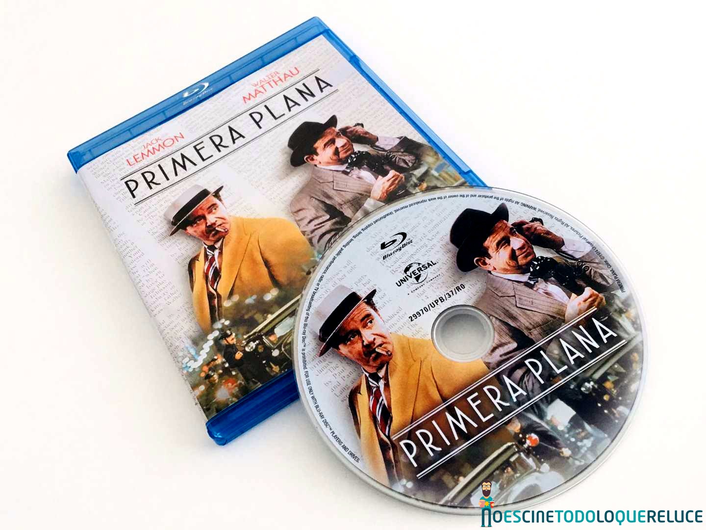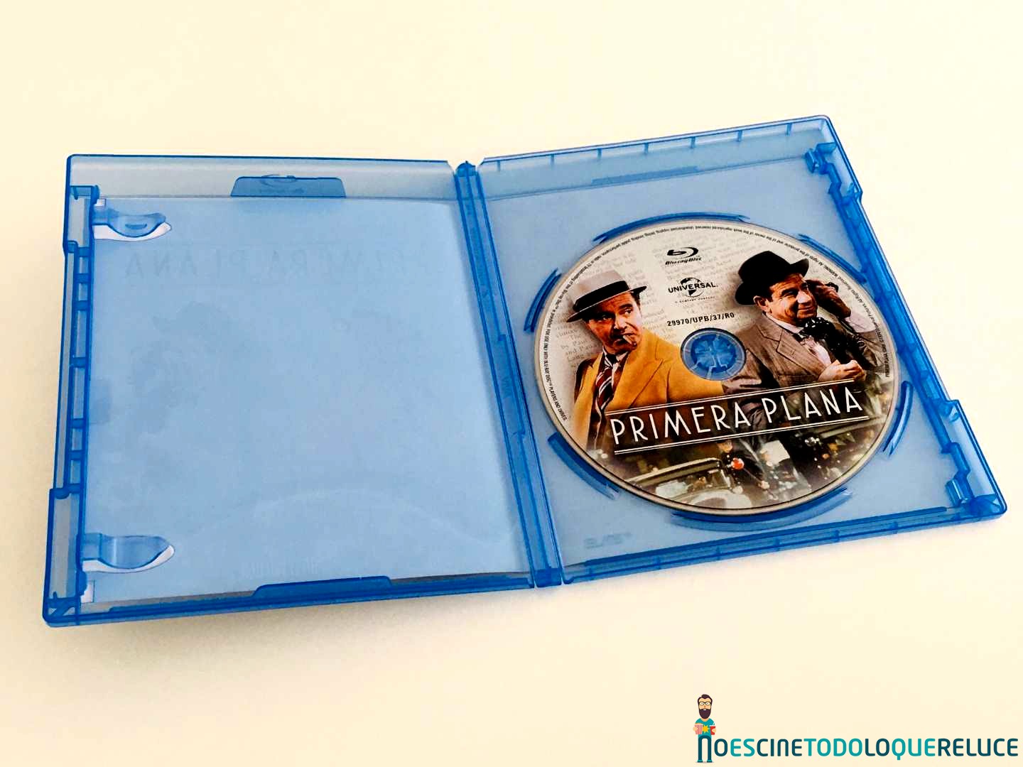 La edición Blu-ray de Primera plana está presentada en el clásico estuche amaray azul, con una versión actualizada del póster en la portada, mientras que la contraportada nos presenta una selección de imágenes de la película junto a los datos técnicos, artísticos y sinopsis. En el interior del estuche nos encontramos el disco Blu-ray serigrafiado con una imagen sacada de la portada.