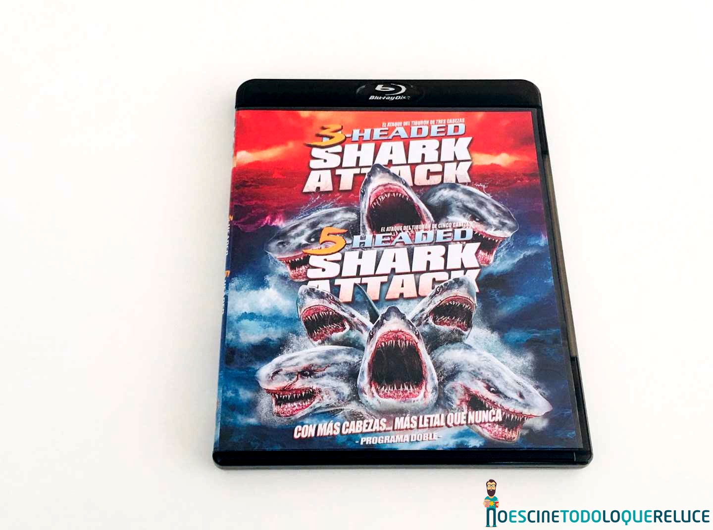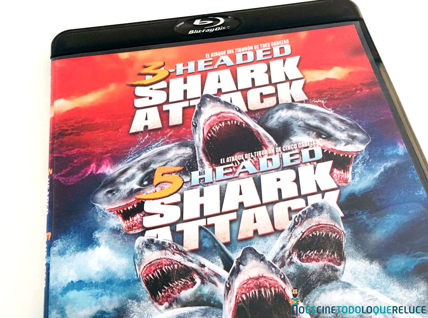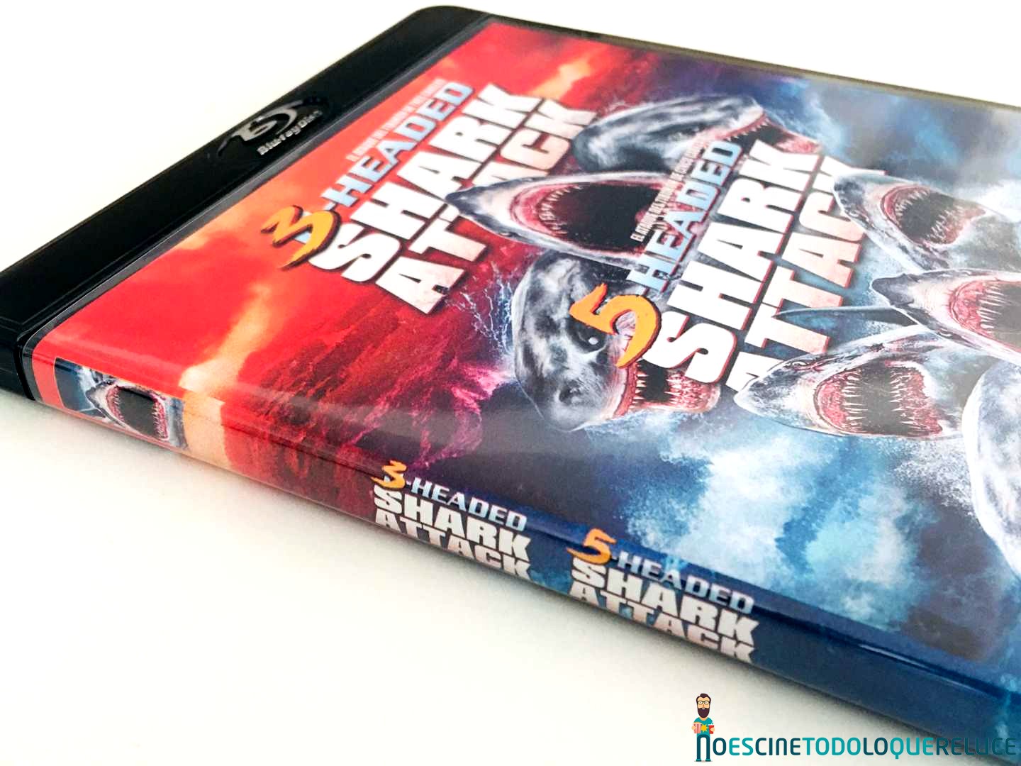 La edición Blu-ray de 3-Headed Shark Attack + 5-Headed Shark Attack está presentada en un estuche negro translúcido, con el póster en la portada, mientras que la contraportada nos presenta una selección de imágenes de la película junto a los datos técnicos, artísticos y sinopsis. En el interior del estuche nos encontramos el disco Blu-ray serigrafiado con una imagen sacada de la portada. El interior nos deja ver la portada reversible con un estilo clásico de los programas dobles de los 80 que se lanzaban en VHS.