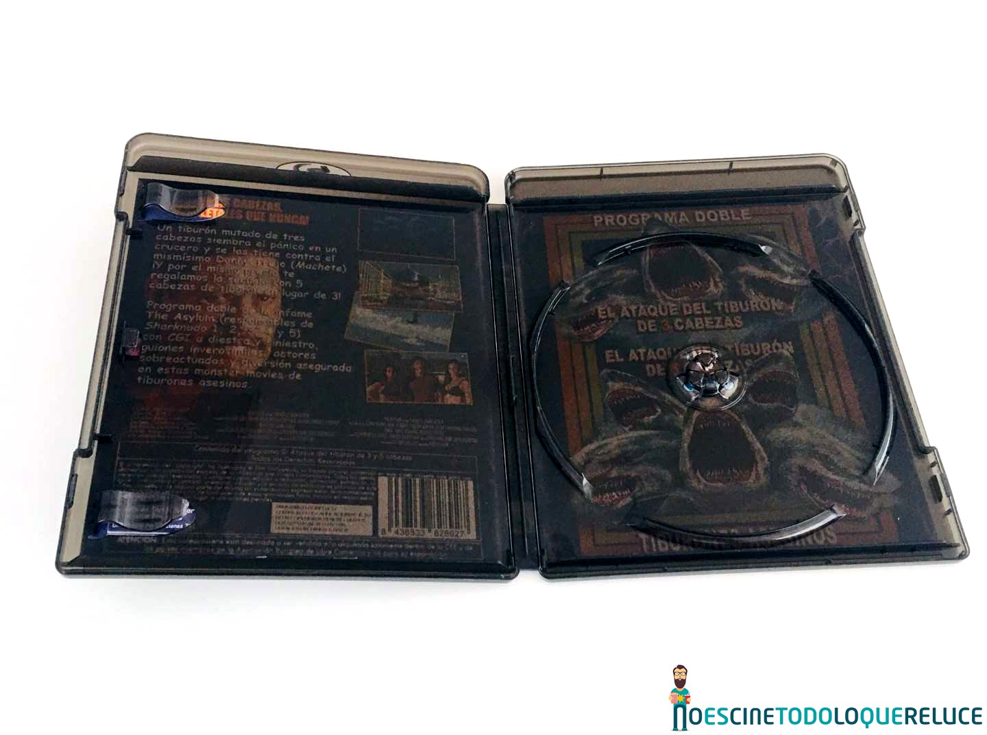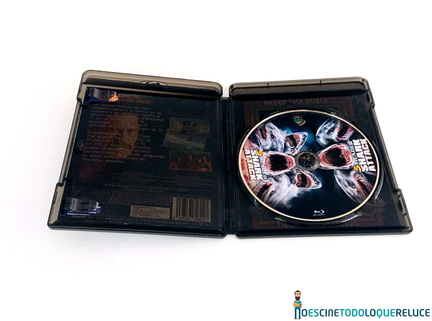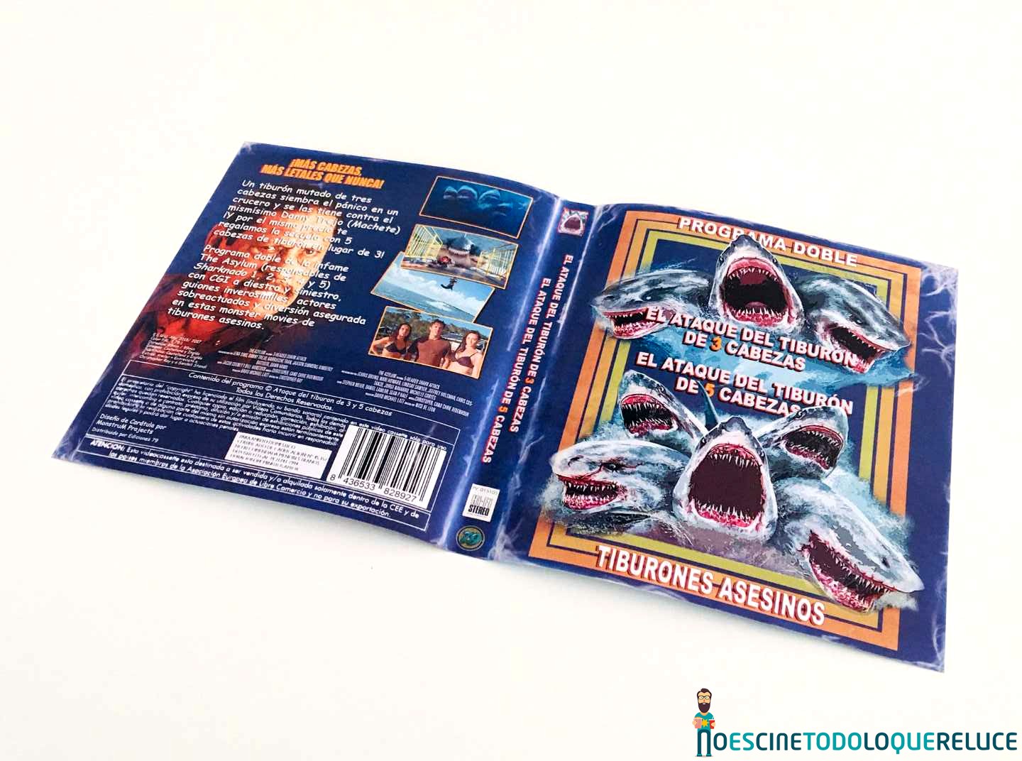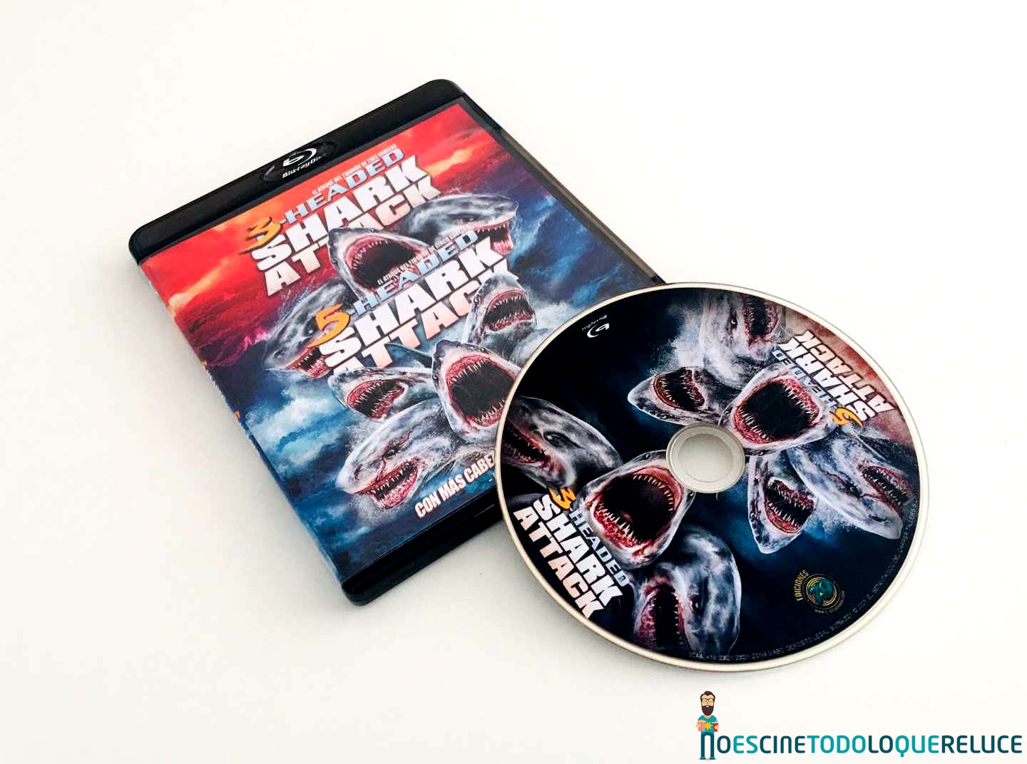 La edición Blu-ray de 3-Headed Shark Attack + 5-Headed Shark Attack está presentada en un estuche negro translúcido, con el póster en la portada, mientras que la contraportada nos presenta una selección de imágenes de la película junto a los datos técnicos, artísticos y sinopsis. En el interior del estuche nos encontramos el disco Blu-ray serigrafiado con una imagen sacada de la portada. El interior nos deja ver la portada reversible con un estilo clásico de los programas dobles de los 80 que se lanzaban en VHS.
