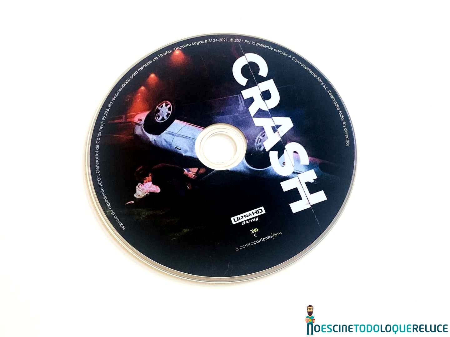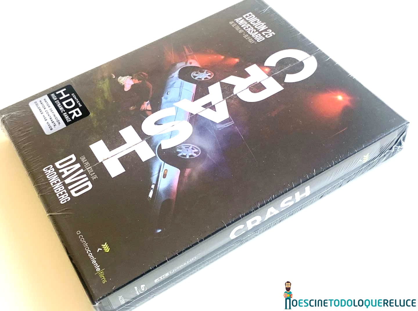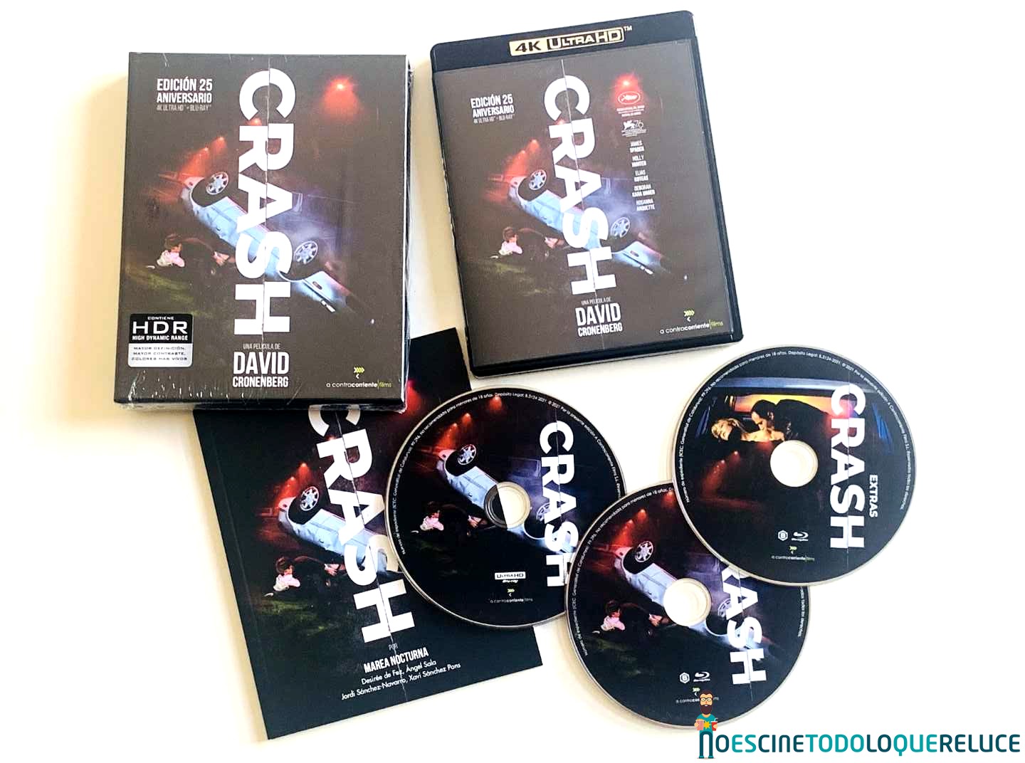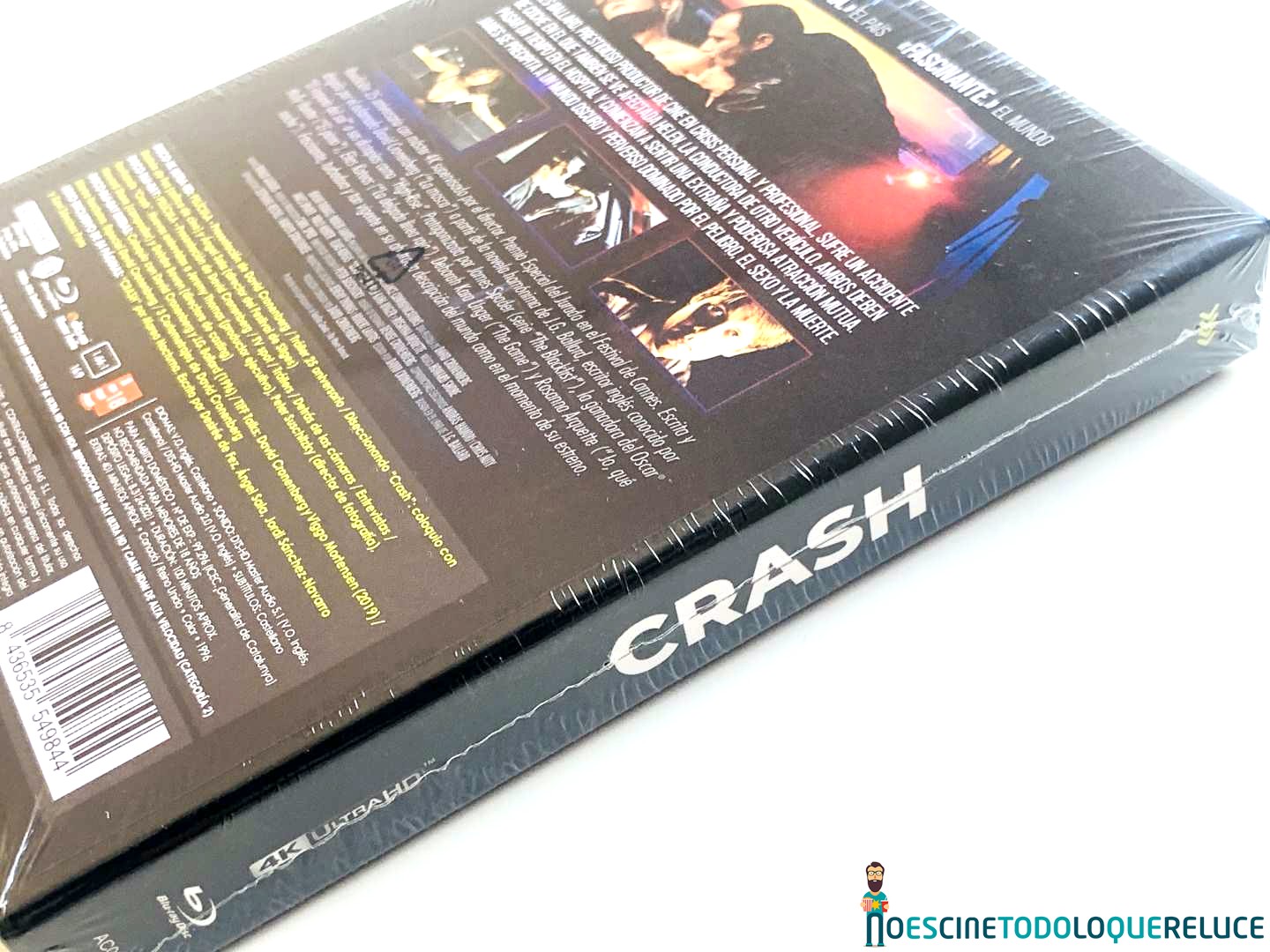 La edición Blu-ray de Crash está presentada en una funda rígido que alberga tanto el estuche amaray negro como un libro exclusivo. Funda y estuche comparten diseño de portada, con el póster del 25º aniversario, aunque cambian contraportada, mostrando ambos imágenes de la película junto a los datos técnicos, artísticos y sinopsis. En el interior del estuche nos encontramos los tres discos (2 para la película en 4K UHD y Bluray, y otro Bluray de extras), serigrafiados a todo color y con el título de la película. El libro exclusivo de 54 páginas es CRASH por Marea Nocturna, escrito por Desirée de Fez, Ángel Sala, Jordi Sánchez-Navarro y Xavi Sánchez Pons, una aproximación poliédrica a la película de culto de David Cronenberg y a la polémica novela de J.G. Ballard en la que se basa, a cargo de cuatro voces imprescindibles de la crítica del cine de género en España.