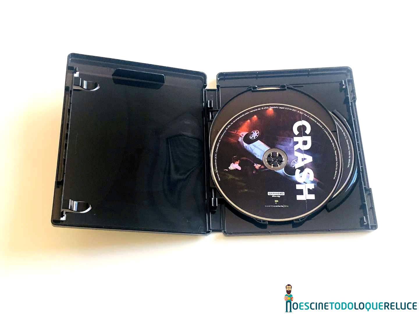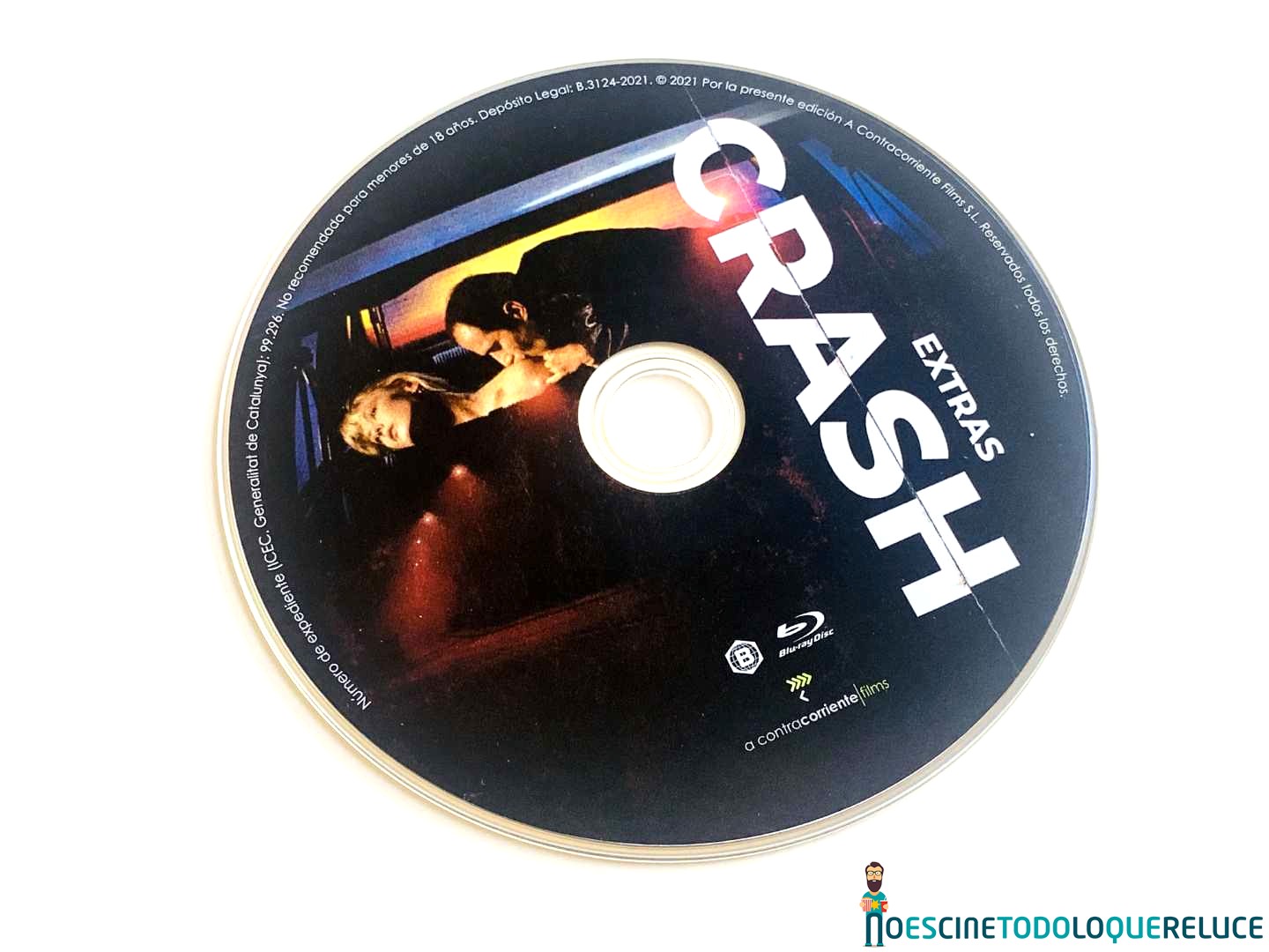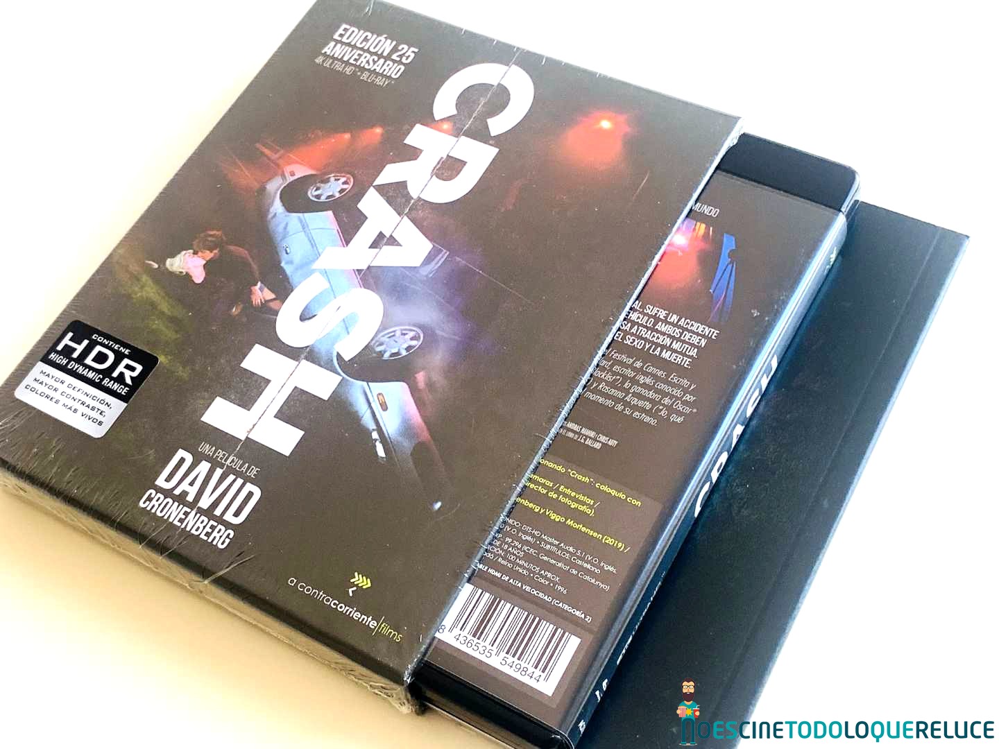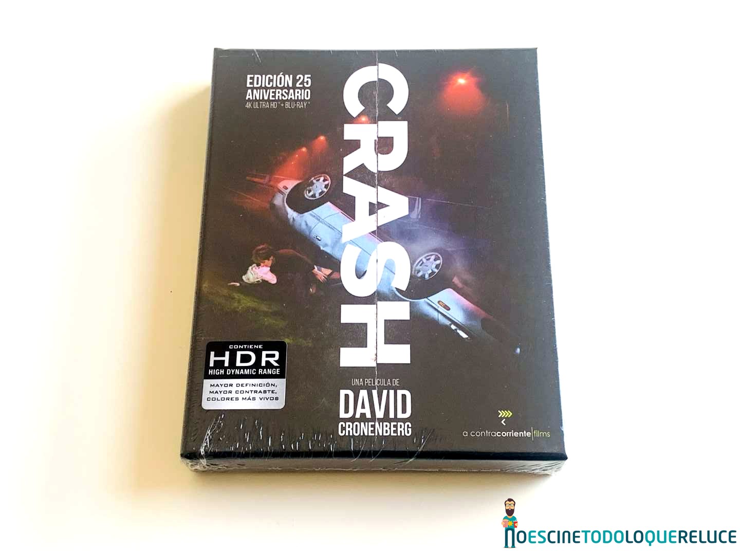 La edición Blu-ray de Crash está presentada en una funda rígido que alberga tanto el estuche amaray negro como un libro exclusivo. Funda y estuche comparten diseño de portada, con el póster del 25º aniversario, aunque cambian contraportada, mostrando ambos imágenes de la película junto a los datos técnicos, artísticos y sinopsis. En el interior del estuche nos encontramos los tres discos (2 para la película en 4K UHD y Bluray, y otro Bluray de extras), serigrafiados a todo color y con el título de la película. El libro exclusivo de 54 páginas es CRASH por Marea Nocturna, escrito por Desirée de Fez, Ángel Sala, Jordi Sánchez-Navarro y Xavi Sánchez Pons, una aproximación poliédrica a la película de culto de David Cronenberg y a la polémica novela de J.G. Ballard en la que se basa, a cargo de cuatro voces imprescindibles de la crítica del cine de género en España.