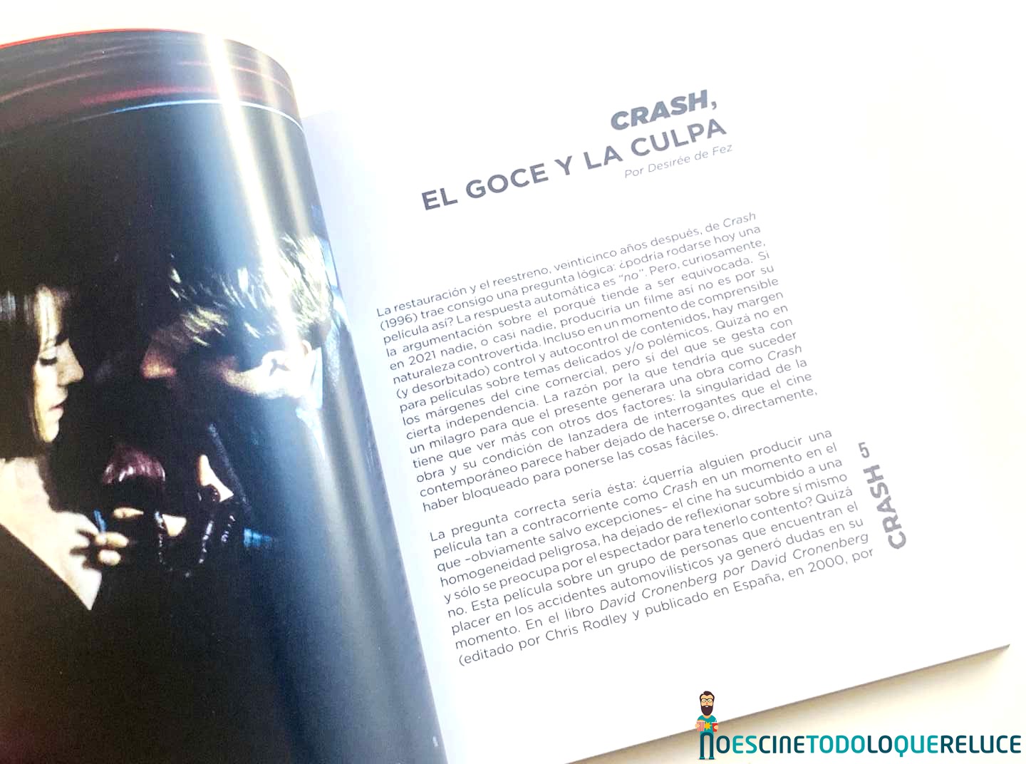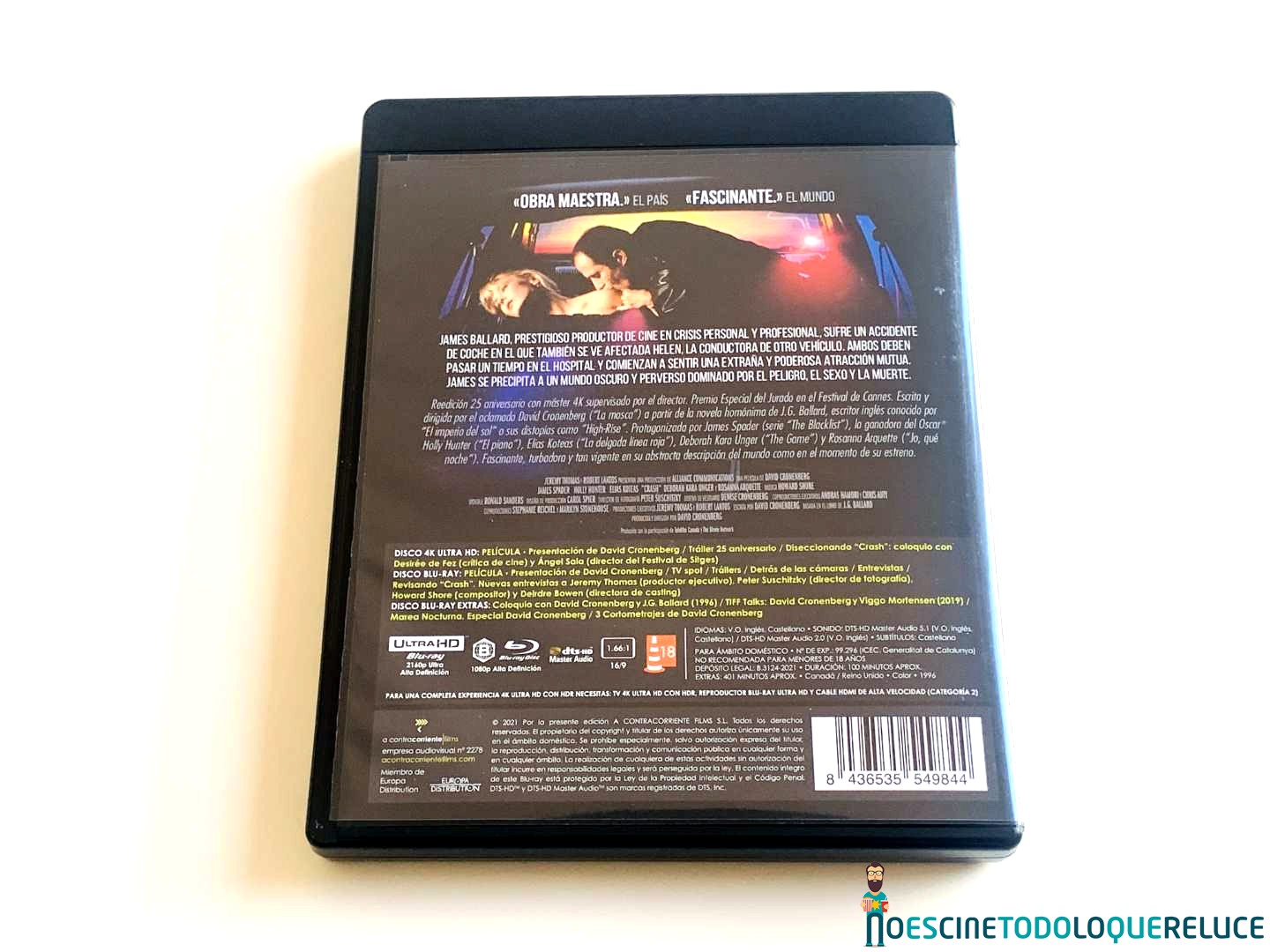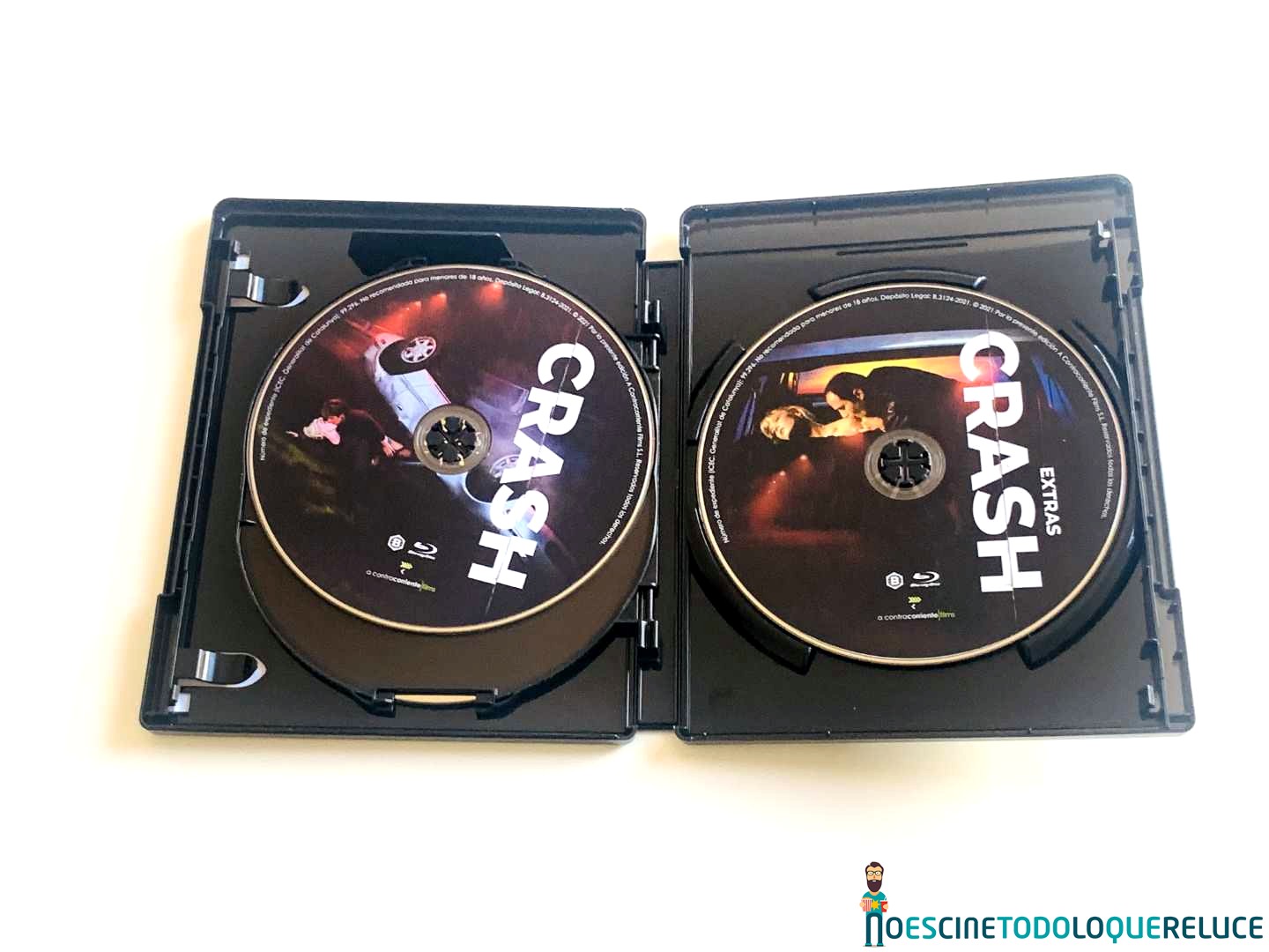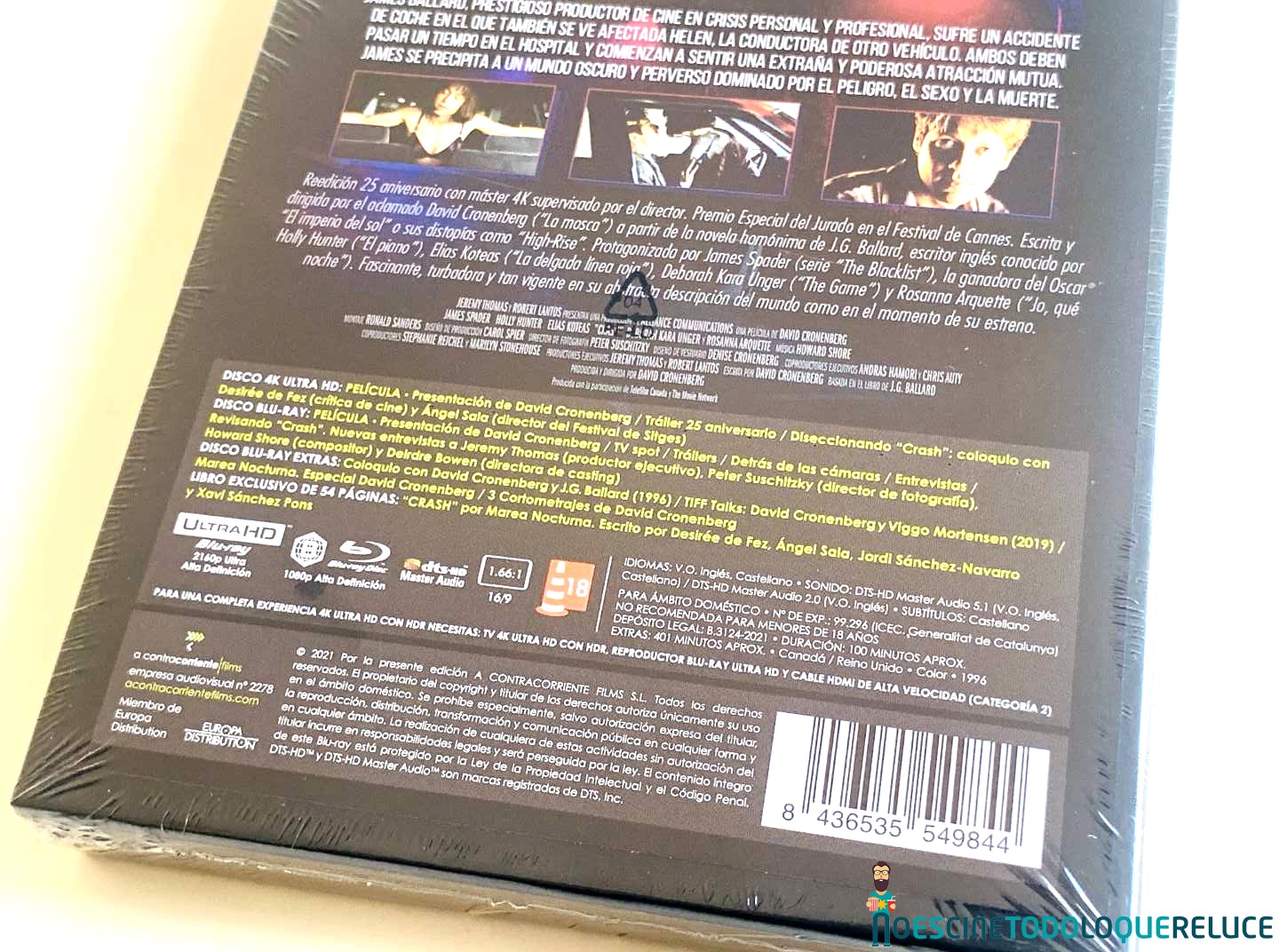 La edición Blu-ray de Crash está presentada en una funda rígido que alberga tanto el estuche amaray negro como un libro exclusivo. Funda y estuche comparten diseño de portada, con el póster del 25º aniversario, aunque cambian contraportada, mostrando ambos imágenes de la película junto a los datos técnicos, artísticos y sinopsis. En el interior del estuche nos encontramos los tres discos (2 para la película en 4K UHD y Bluray, y otro Bluray de extras), serigrafiados a todo color y con el título de la película. El libro exclusivo de 54 páginas es CRASH por Marea Nocturna, escrito por Desirée de Fez, Ángel Sala, Jordi Sánchez-Navarro y Xavi Sánchez Pons, una aproximación poliédrica a la película de culto de David Cronenberg y a la polémica novela de J.G. Ballard en la que se basa, a cargo de cuatro voces imprescindibles de la crítica del cine de género en España.