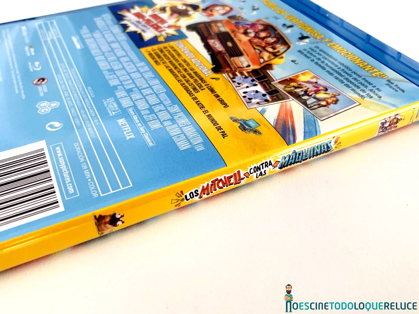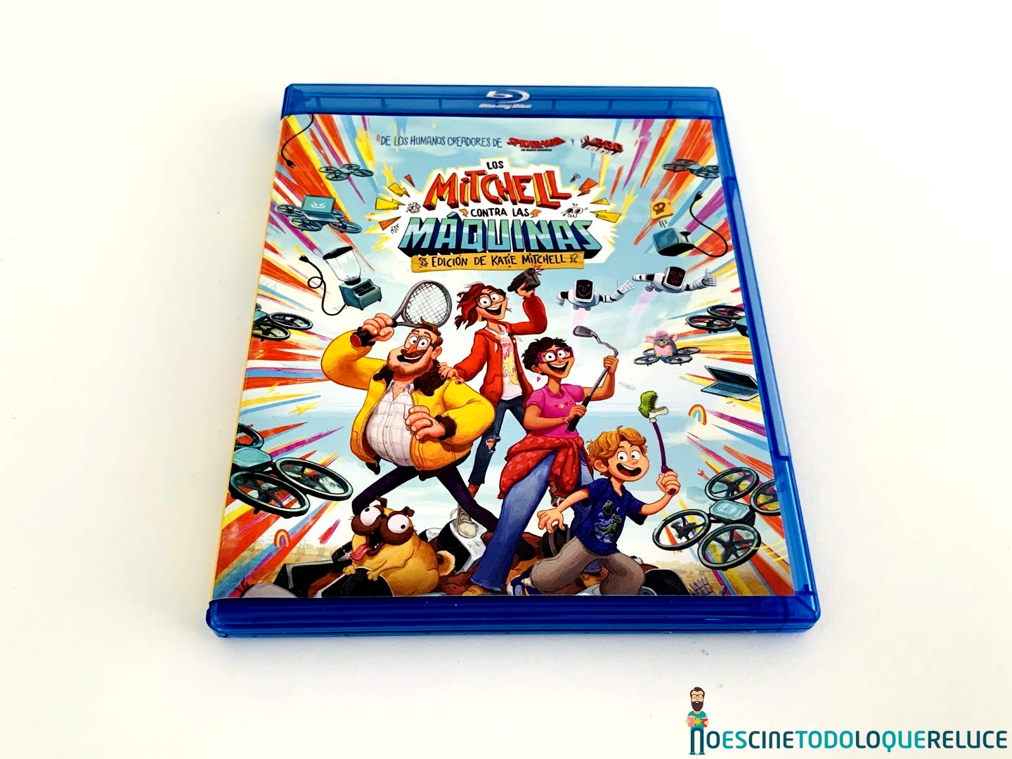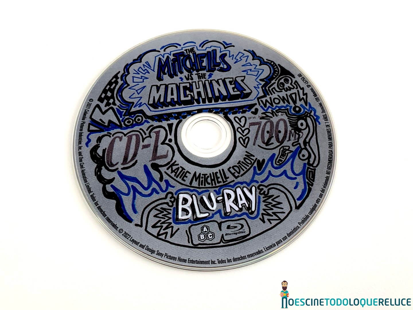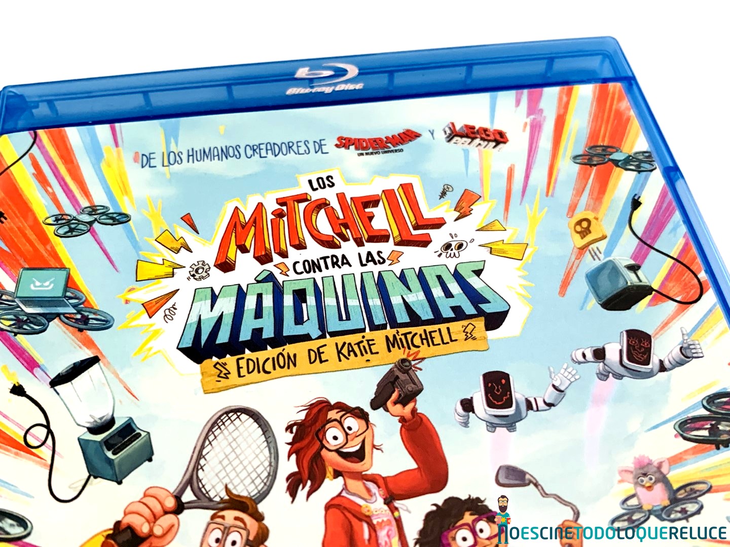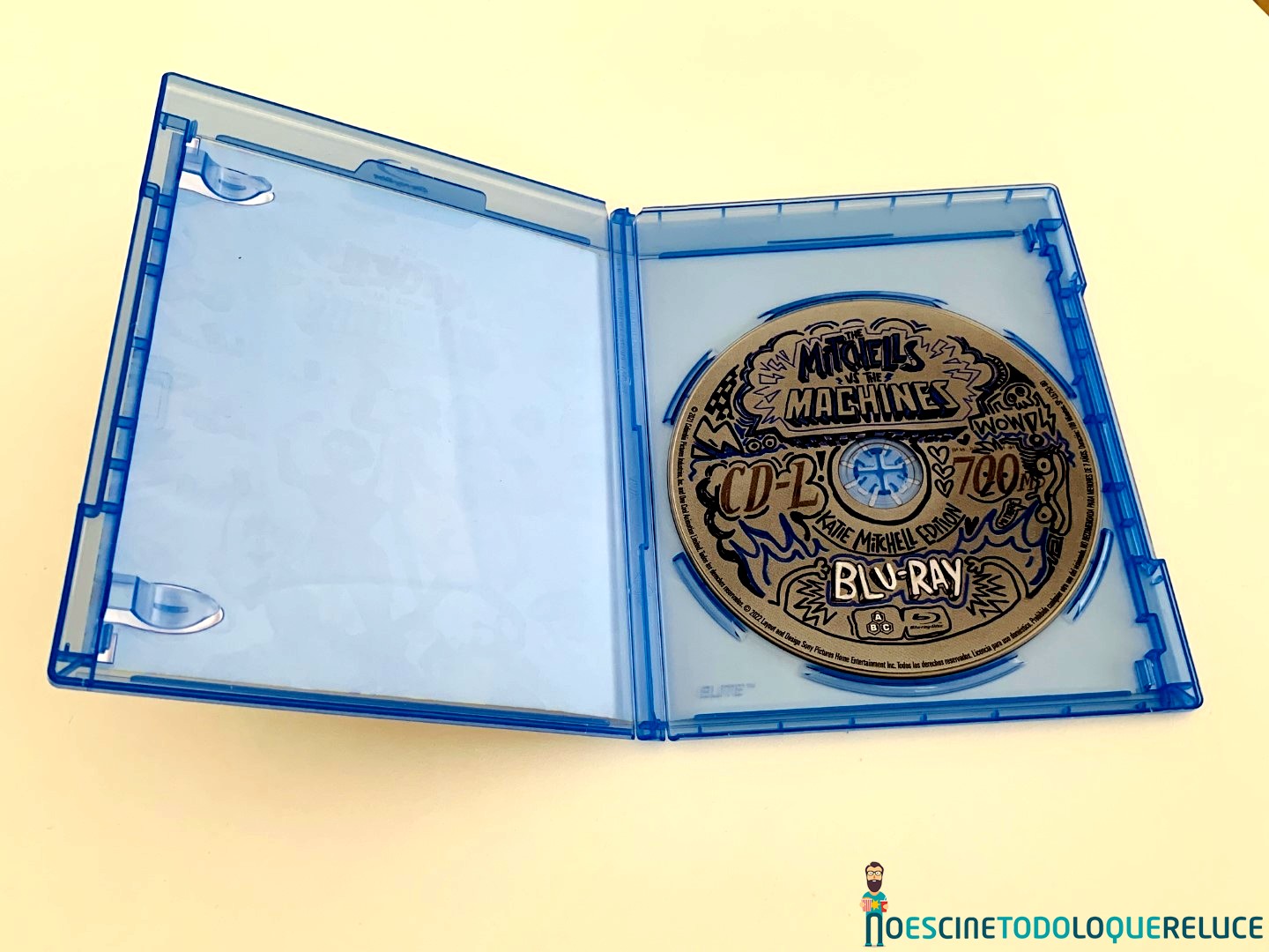 La edición Blu-ray de Los Mitchell contra las máquinas está presentada en el clásico estuche azul de este formato, con el póster español en la portada, mientras que la contraportada nos presenta una selección de imágenes de la película junto a los datos técnicos, artísticos y sinopsis. En el interior del estuche nos encontramos el disco Blu-ray serigrafiado de forma original, como si fuera uno de esos CD-R que grabábamos en casa antaño y escribíamos sobre ellos su contenido, en este caso «ilustrado» por la protagonista.