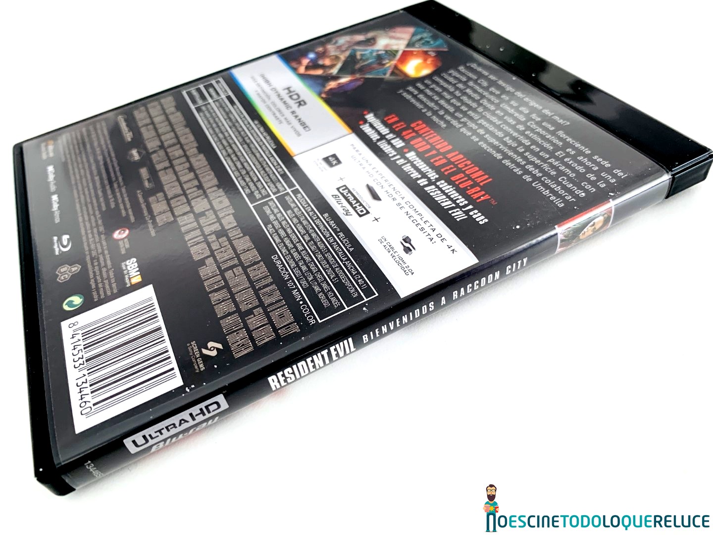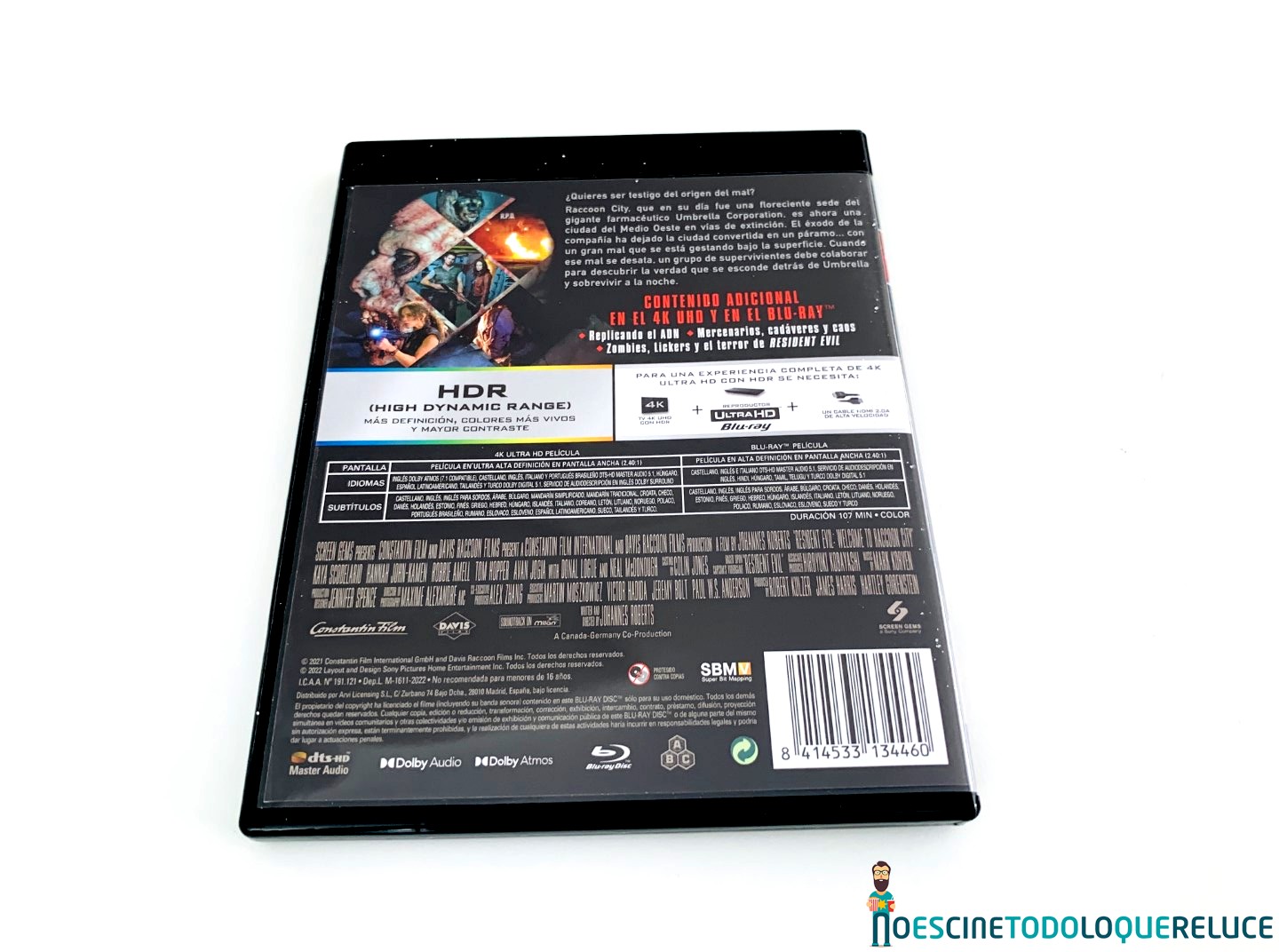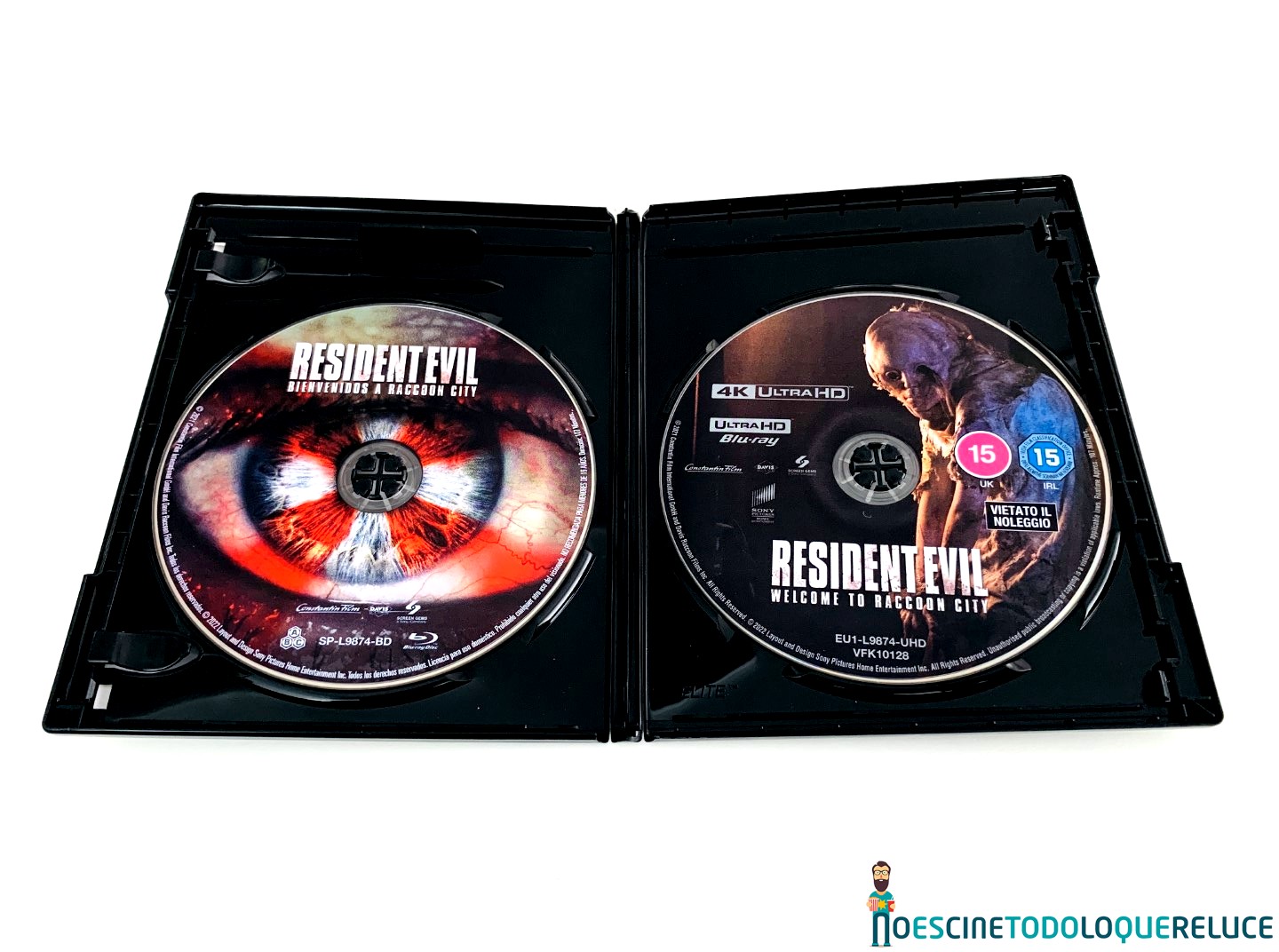 La edición 4K UHD + Blu-ray de Resident Evil: Bienvenidos a Raccoon City está presentada en el clásico estuche negro para el formato 4K, con el póster español en la portada, mientras que la contraportada nos presenta una selección de imágenes de la película junto a los datos técnicos, artísticos y sinopsis. En el interior del estuche nos encontramos tanto el disco 4K UHD como el disco Blu-ray, serigrafiados cada uno con una imagen distinta y el título en inglés y en español, respectivamente.