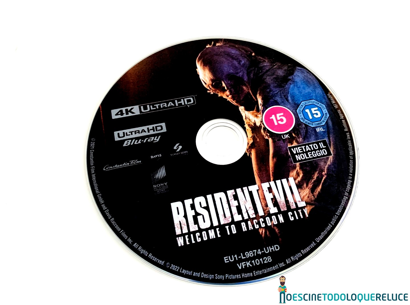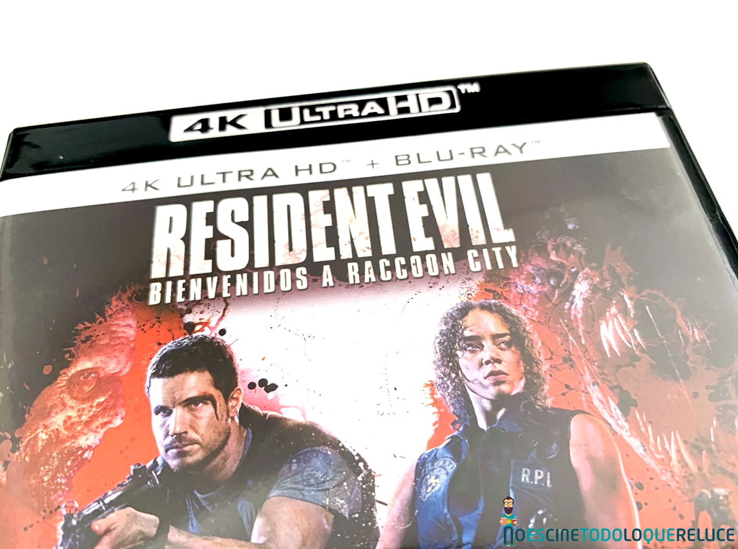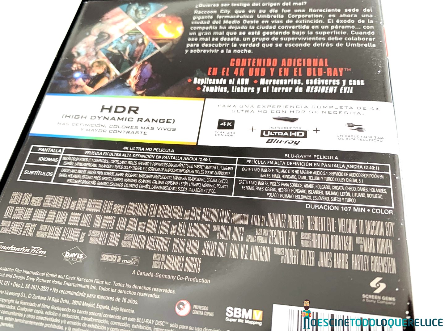 La edición 4K UHD + Blu-ray de Resident Evil: Bienvenidos a Raccoon City está presentada en el clásico estuche negro para el formato 4K, con el póster español en la portada, mientras que la contraportada nos presenta una selección de imágenes de la película junto a los datos técnicos, artísticos y sinopsis. En el interior del estuche nos encontramos tanto el disco 4K UHD como el disco Blu-ray, serigrafiados cada uno con una imagen distinta y el título en inglés y en español, respectivamente.