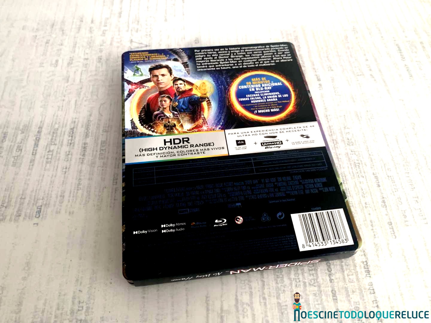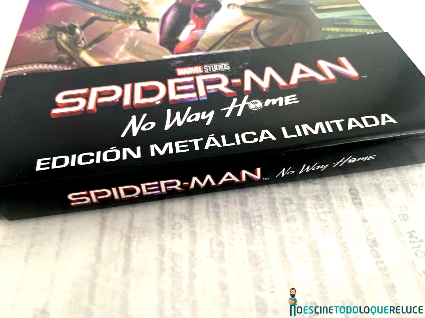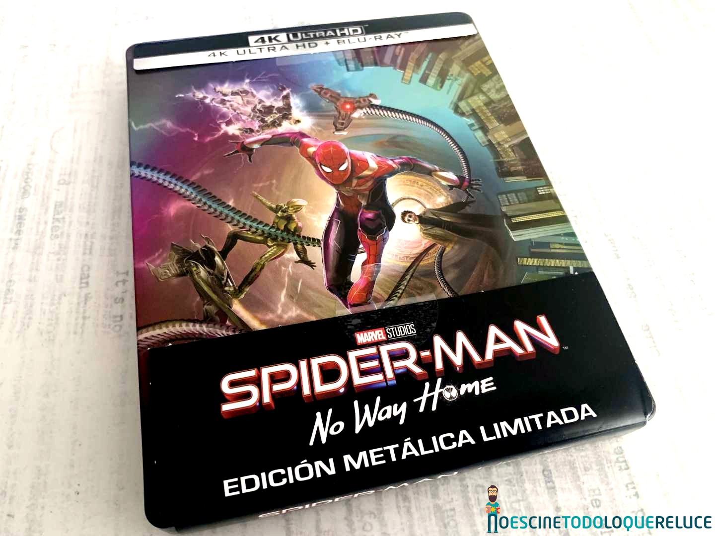 La edición 4K UHD limitada en caja metálica de Spider-Man: No Way Home luce un diseño ilustrado centrado en Spider-Man y Doctor Strange en portada y contraportada, respectivamente. El formato de los discos que incluye está indicado en la parte frontal del papel pegado al Steelbook, en cuya parte trasera se incluye la sinopsis, detalles técnicos y artísticos, y una selección de imágenes de los protagonistas.