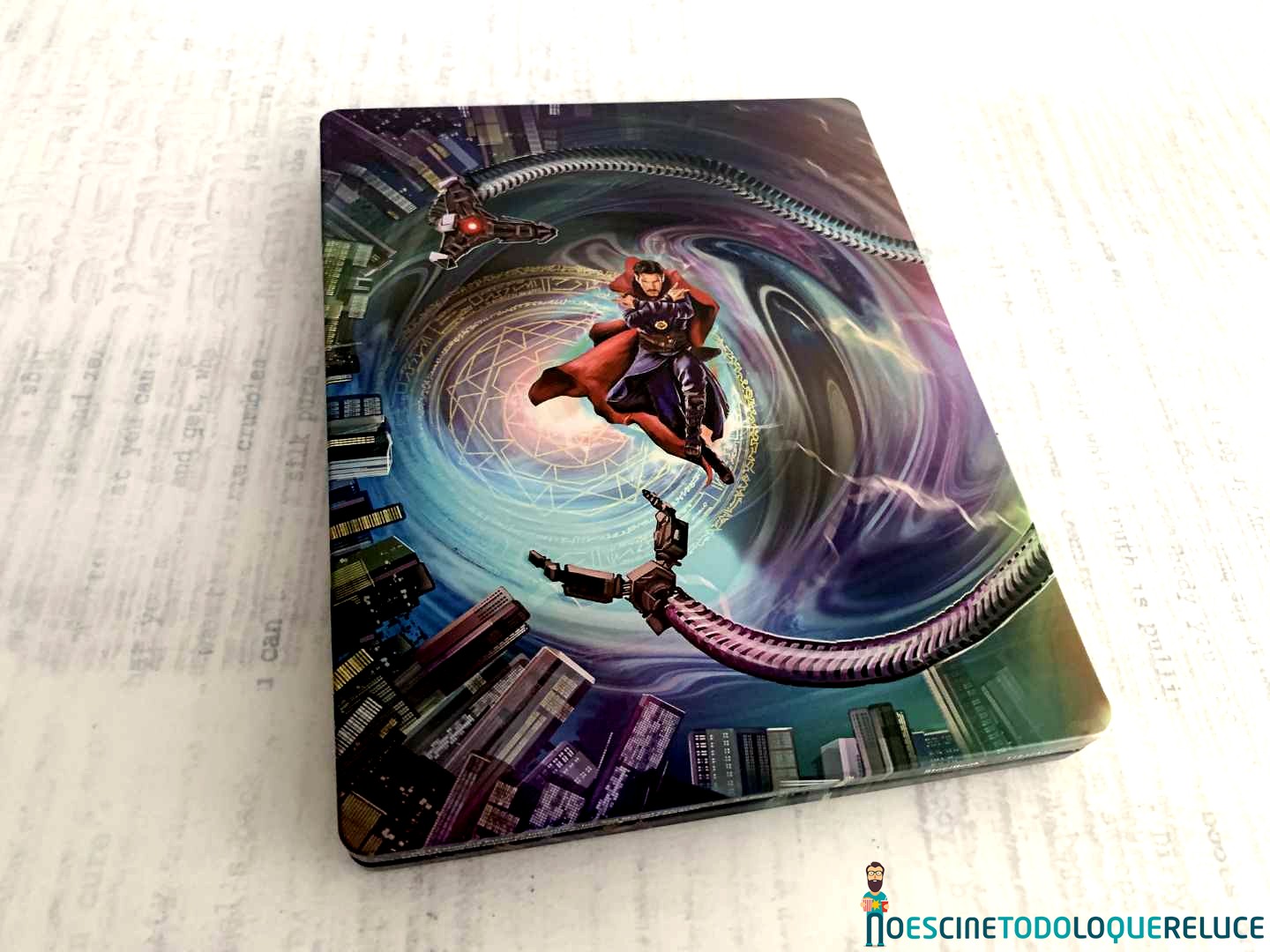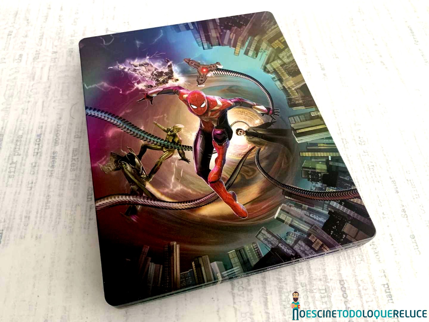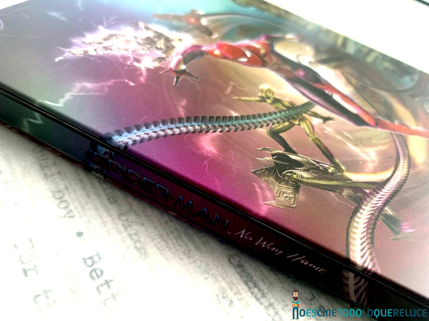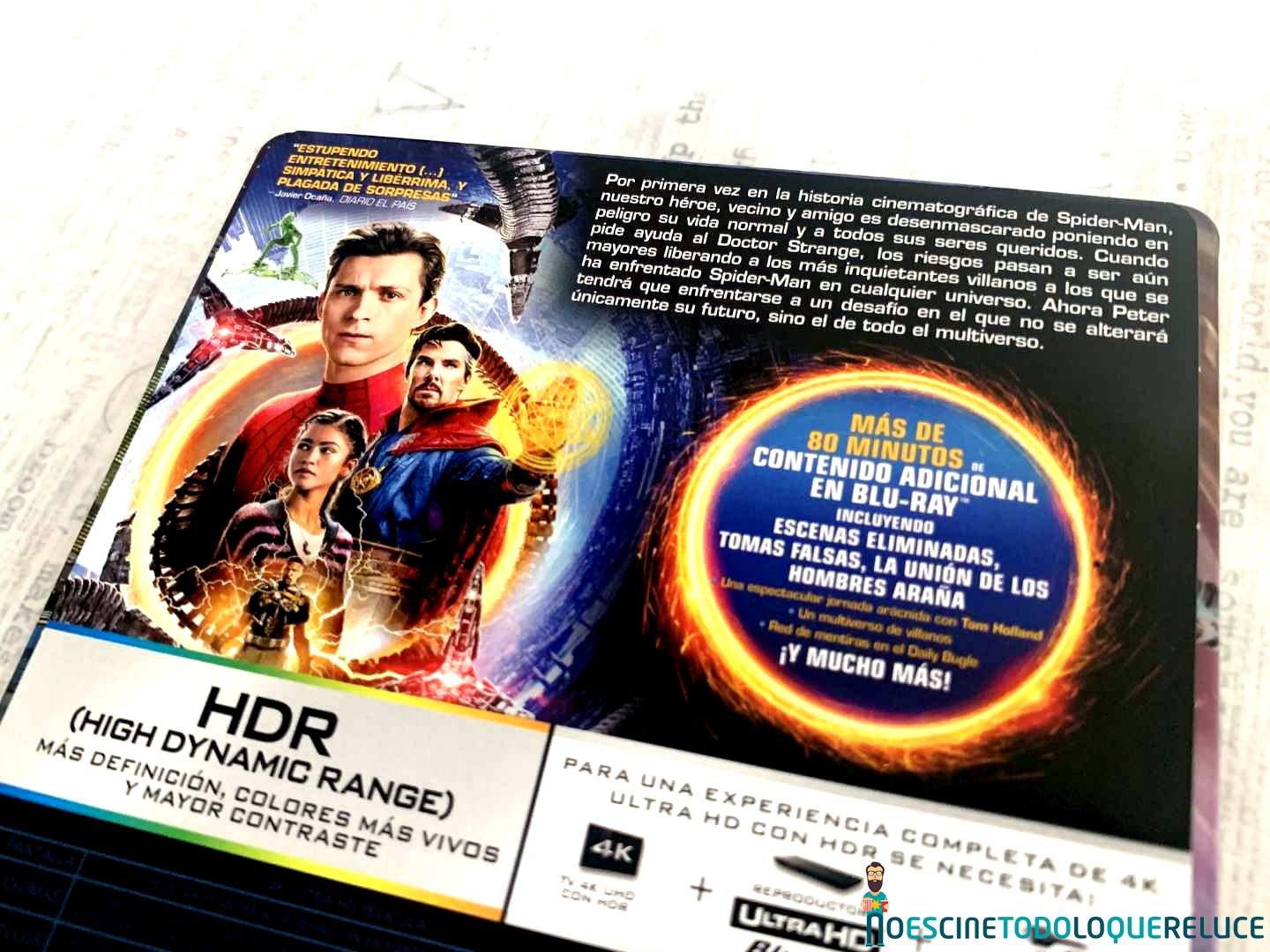 La edición 4K UHD limitada en caja metálica de Spider-Man: No Way Home luce un diseño ilustrado centrado en Spider-Man y Doctor Strange en portada y contraportada, respectivamente. El formato de los discos que incluye está indicado en la parte frontal del papel pegado al Steelbook, en cuya parte trasera se incluye la sinopsis, detalles técnicos y artísticos, y una selección de imágenes de los protagonistas.