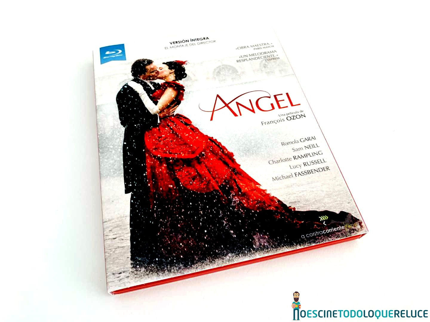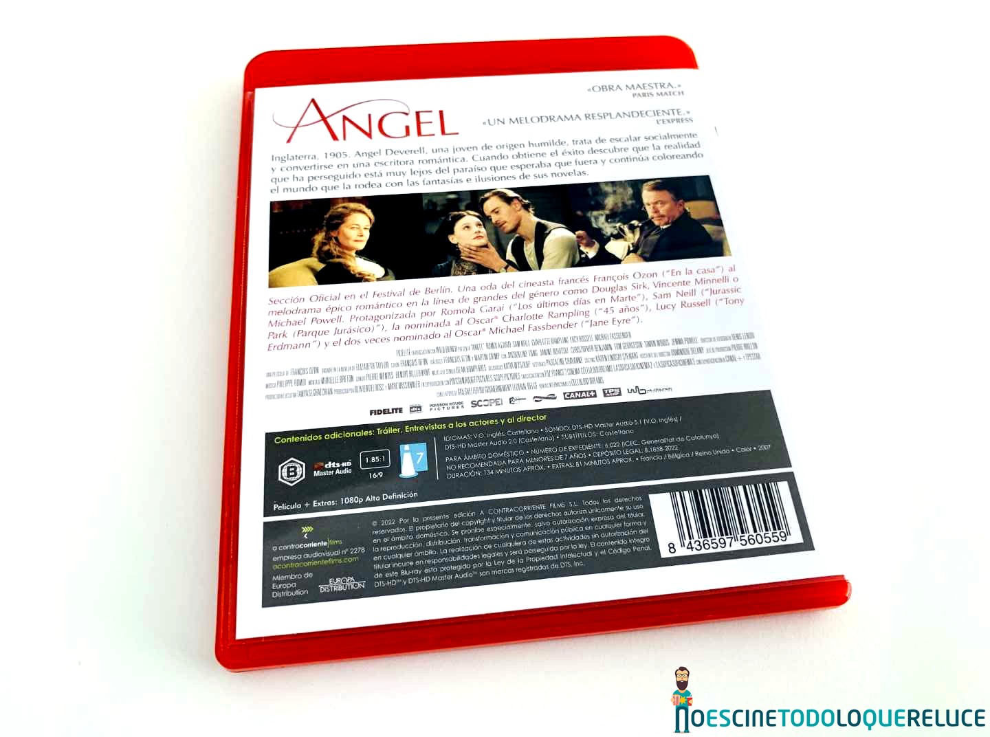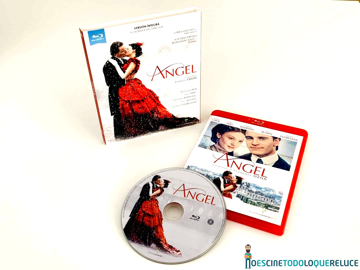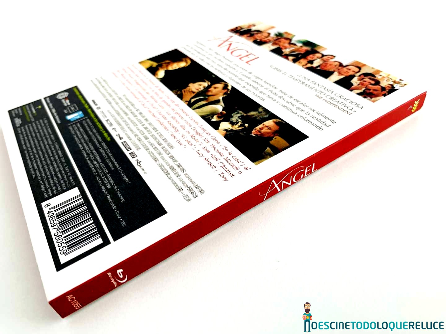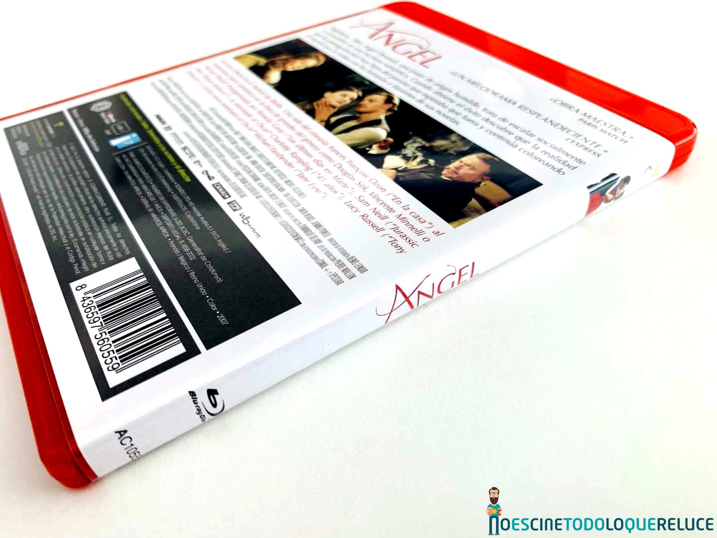 La edición Blu-ray de Ángel está presentada con una funda, como es habitual en muchos títulos de A Contracorriente Films. En su interior alberga un estuche rojo, a juego con el vestido que luce la protagonista en la portada. Funda y estuche lucen distinta portada, aunque manteniendo una uniformidad, mientras que la contraportada de la funda incorpora una imagen adicional a la del estuche, junto a los datos técnicos, artísticos y sinopsis. En el interior del estuche nos encontramos el disco Blu-ray con la misma imagen de la portada de la funda.