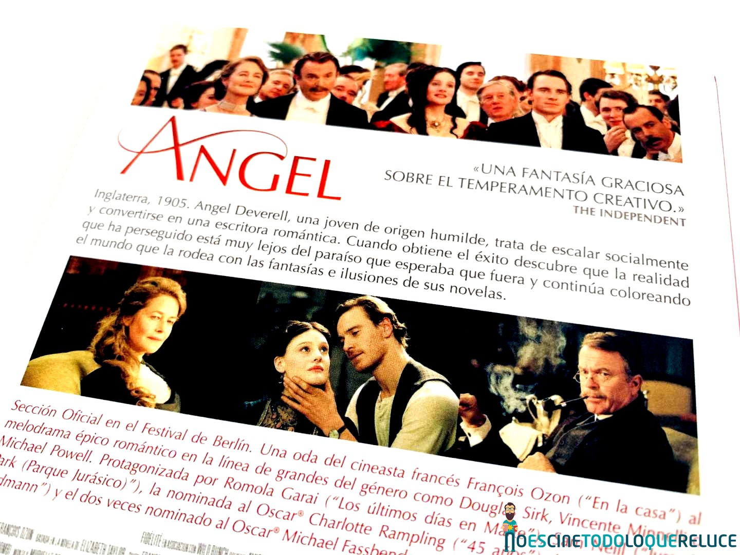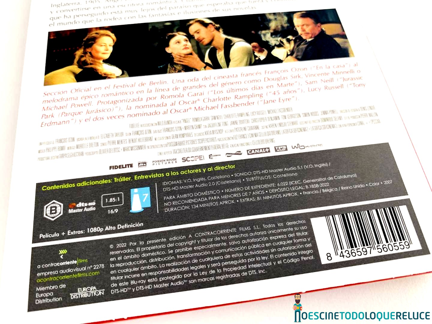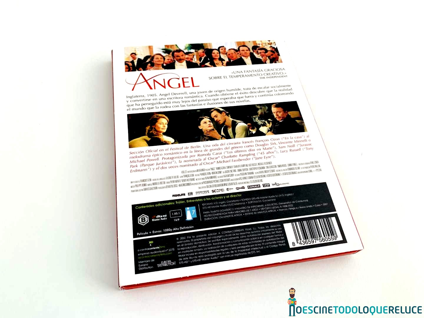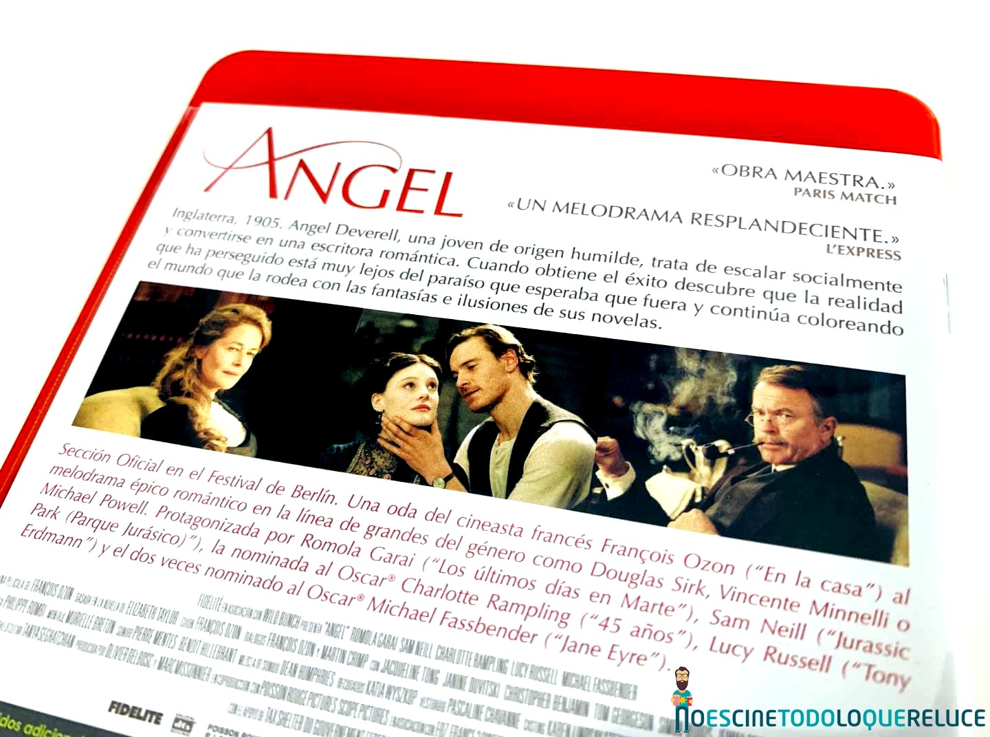 La edición Blu-ray de Ángel está presentada con una funda, como es habitual en muchos títulos de A Contracorriente Films. En su interior alberga un estuche rojo, a juego con el vestido que luce la protagonista en la portada. Funda y estuche lucen distinta portada, aunque manteniendo una uniformidad, mientras que la contraportada de la funda incorpora una imagen adicional a la del estuche, junto a los datos técnicos, artísticos y sinopsis. En el interior del estuche nos encontramos el disco Blu-ray con la misma imagen de la portada de la funda.